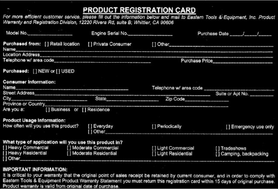 Eastern Tools & Equipment, Inc. welcomes warranty repair and apologizes to you for being inconvenienced.