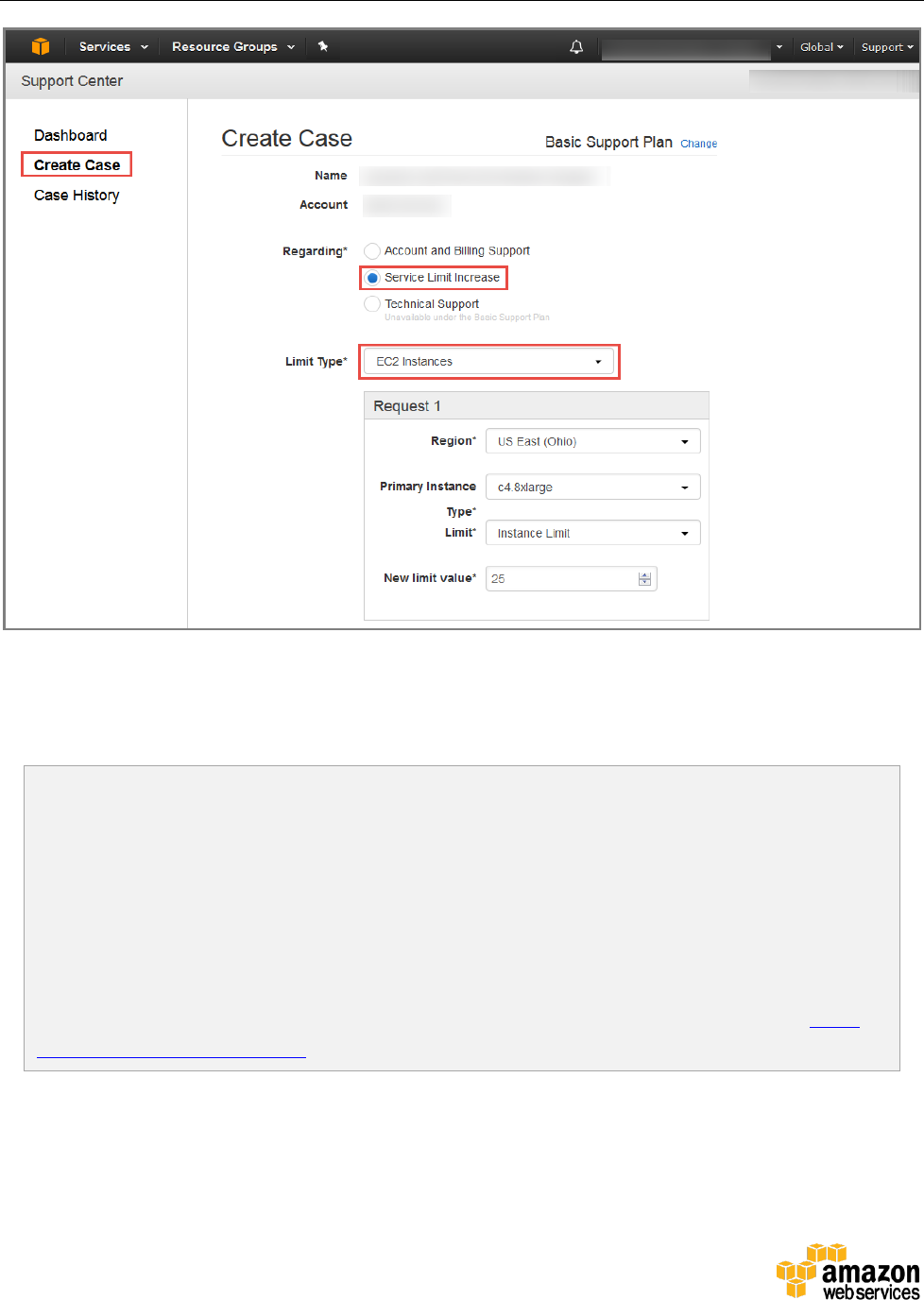 Support Center to increase the Amazon EC2 limit