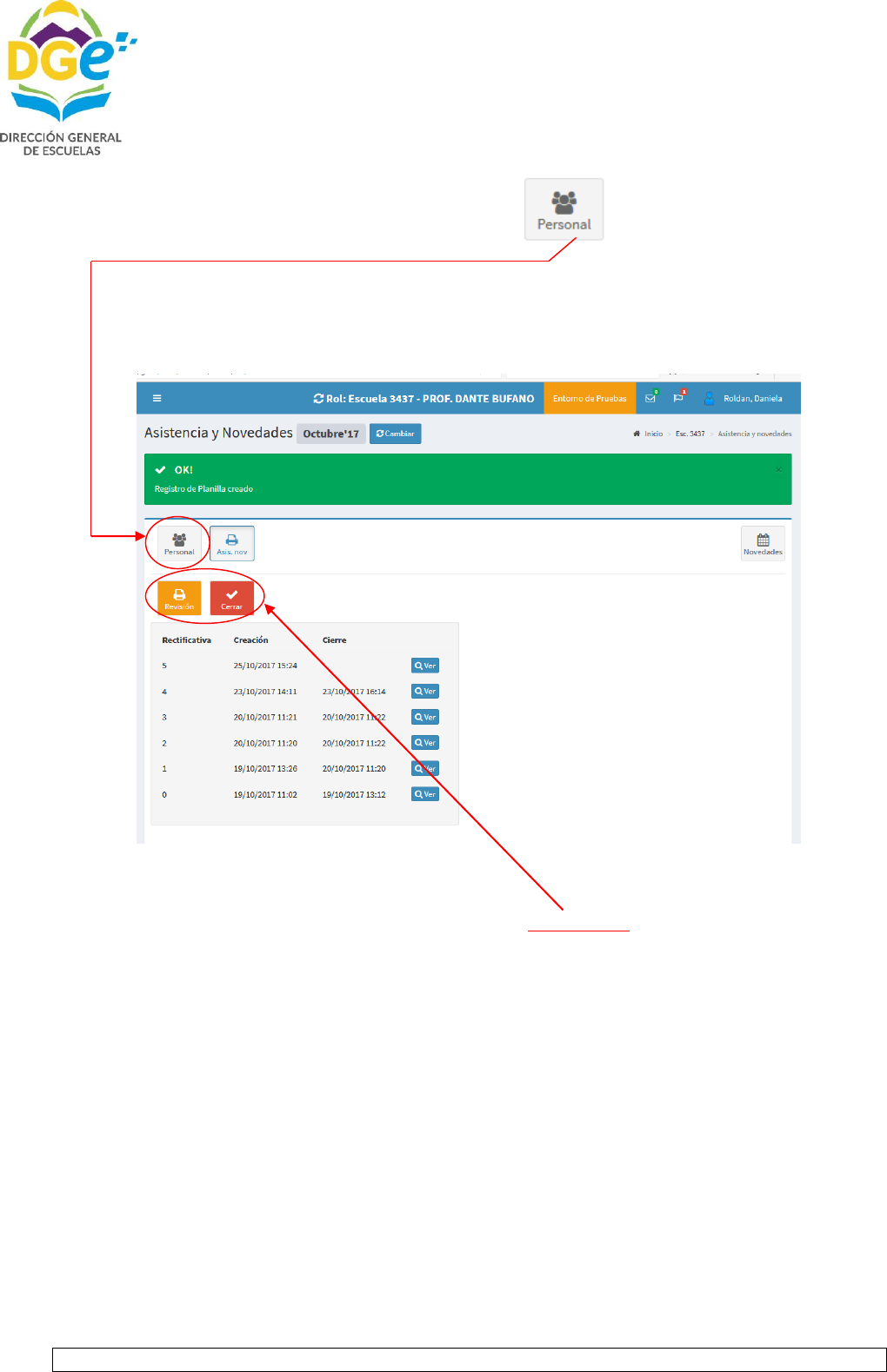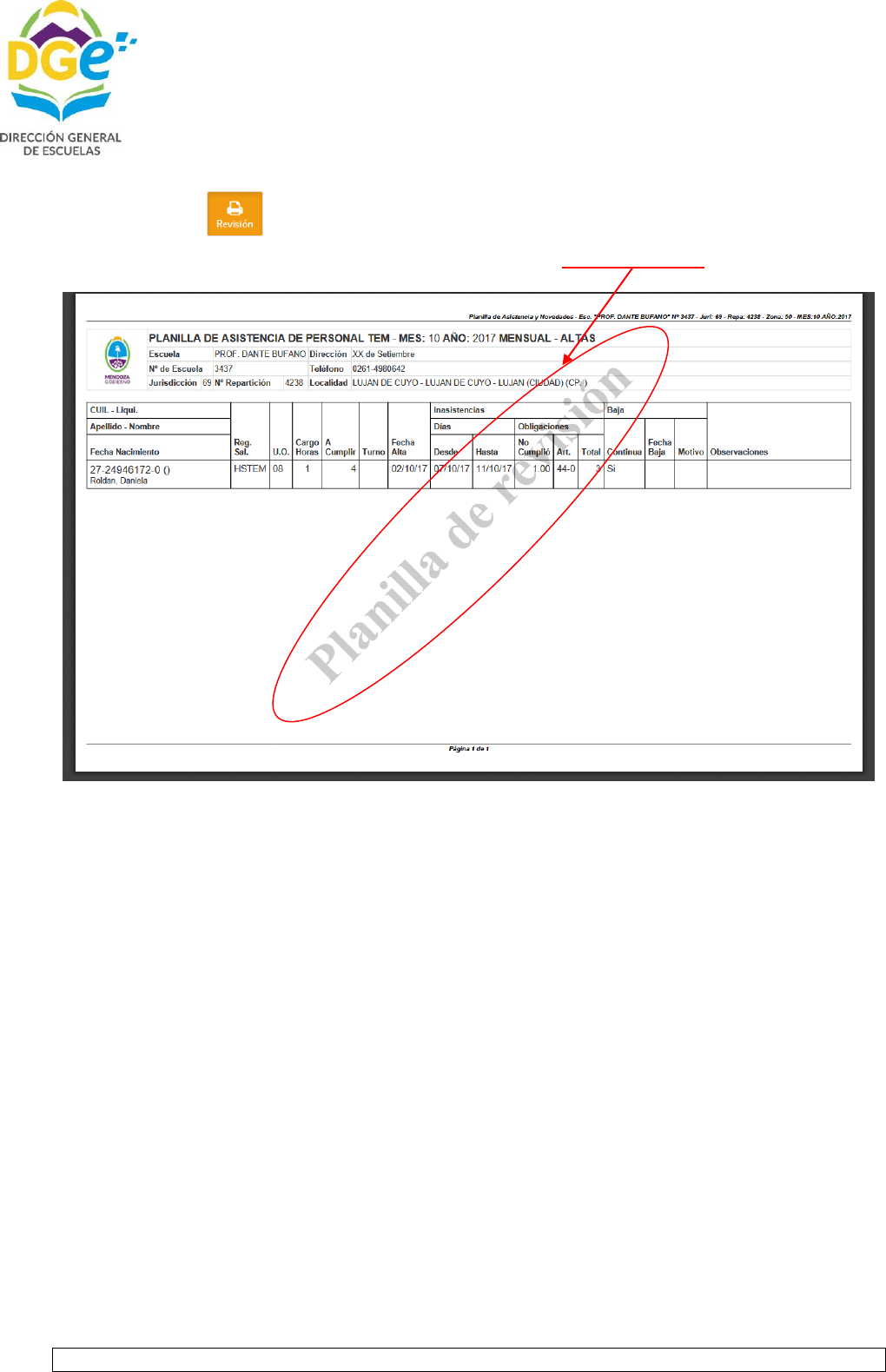 Nos aparece en pantalla la planilla de asistencia con la leyenda “Planilla de revisión”