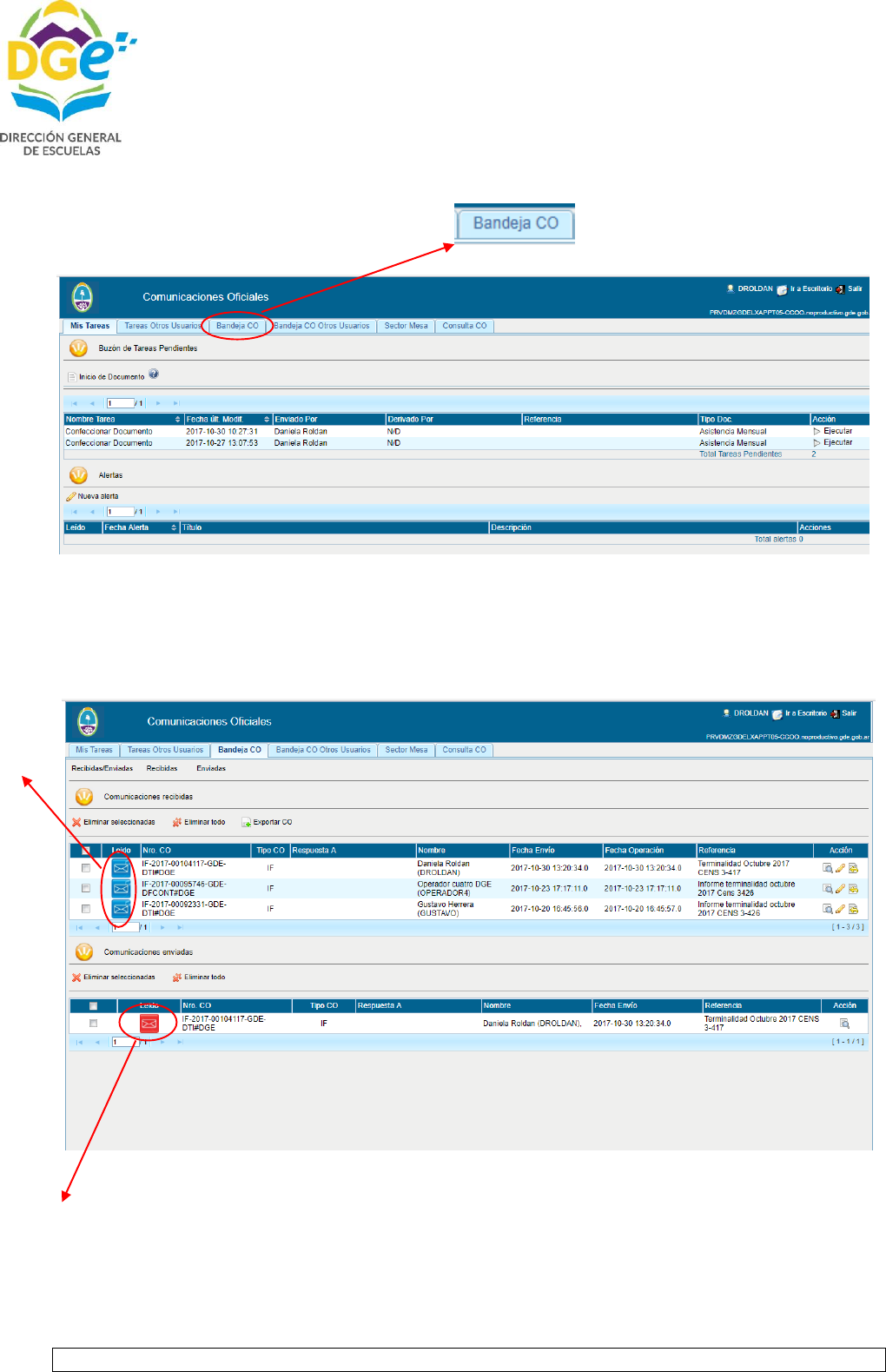 En esta pantalla veremos los documentos recibidos en azul y los enviados en rojo y cuando son leídos