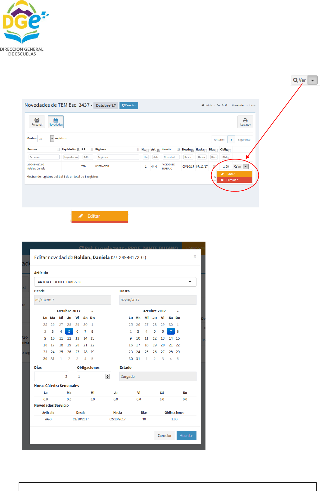 Al hacer clic en se abrirá la pantalla para que pueda modificar la novedad