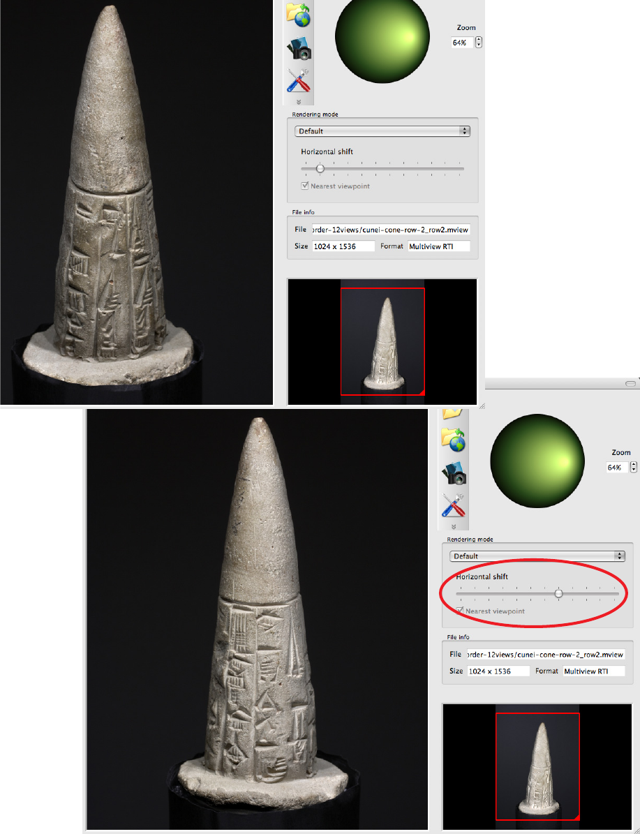 RTIViewer allows you to view multi-view RTIs; that is, a set of RTIs that were created from multiple camera