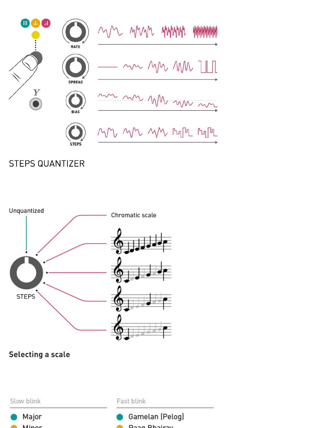 factor relative to X2, from 1⁄64 to 1), SPREAD, BIAS and STEPS while the button is held. The Y output is