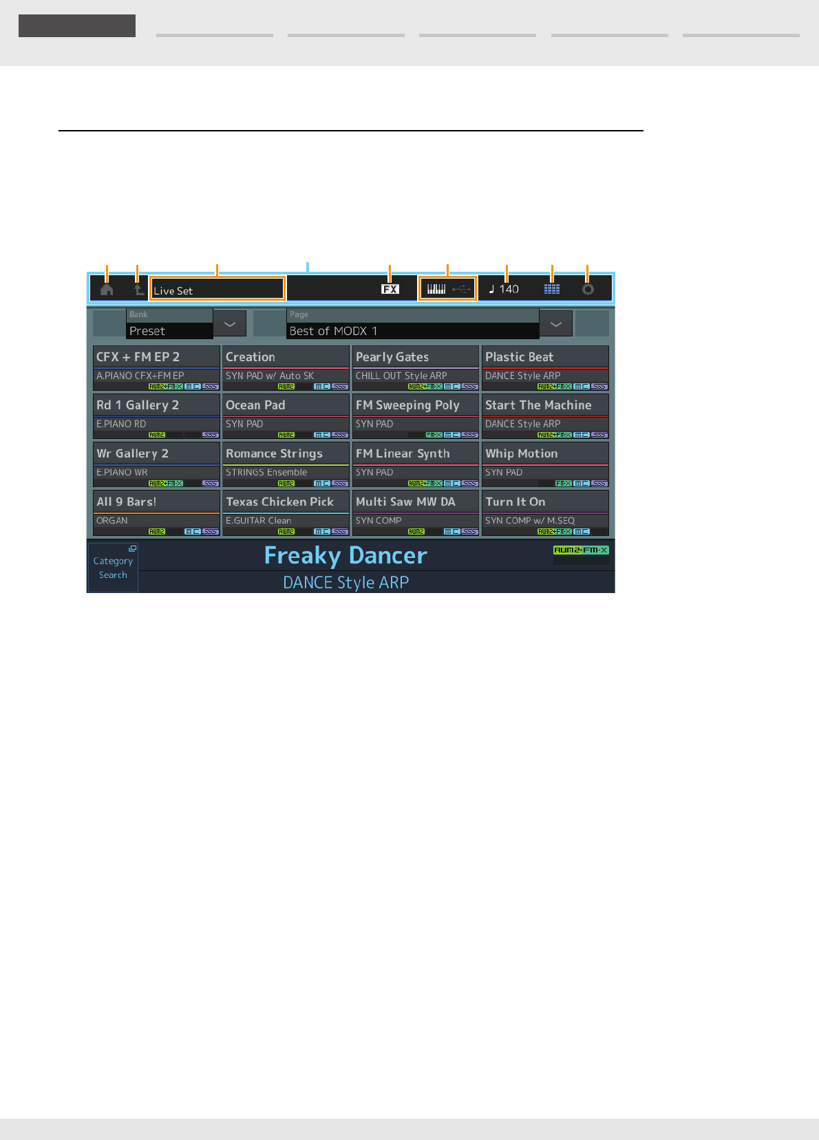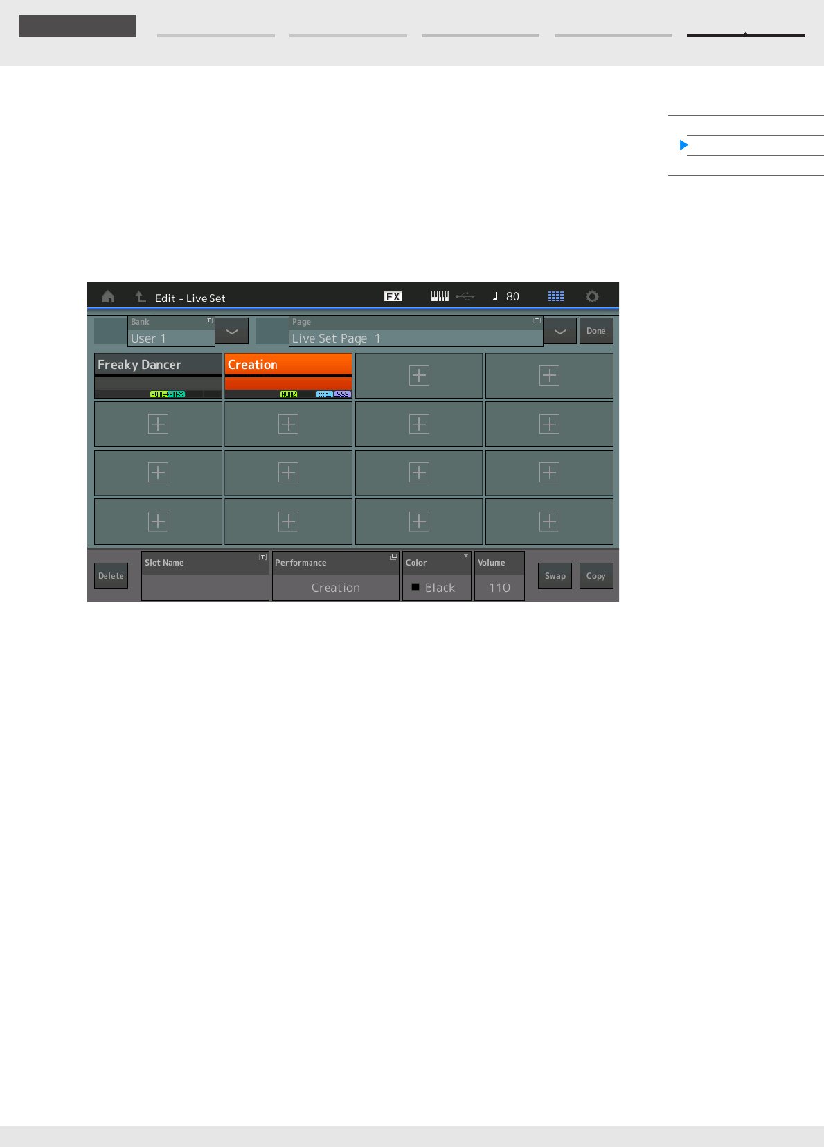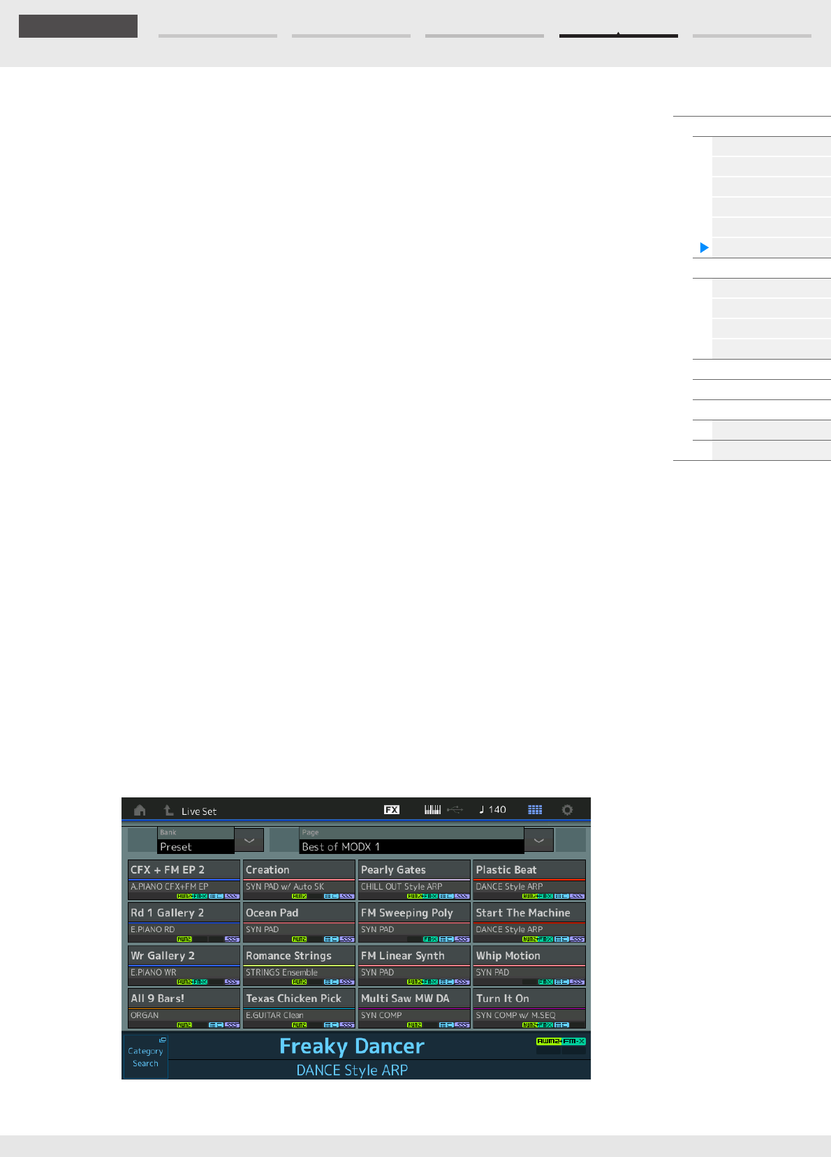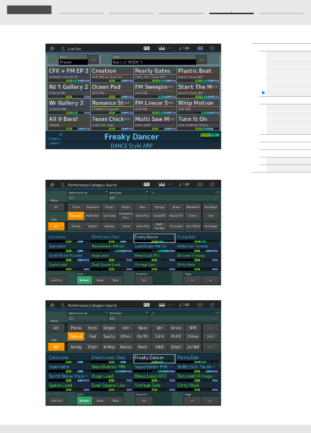 Live Set is a list in which Performances can be freely arranged. Up to 16 Performances can be selected