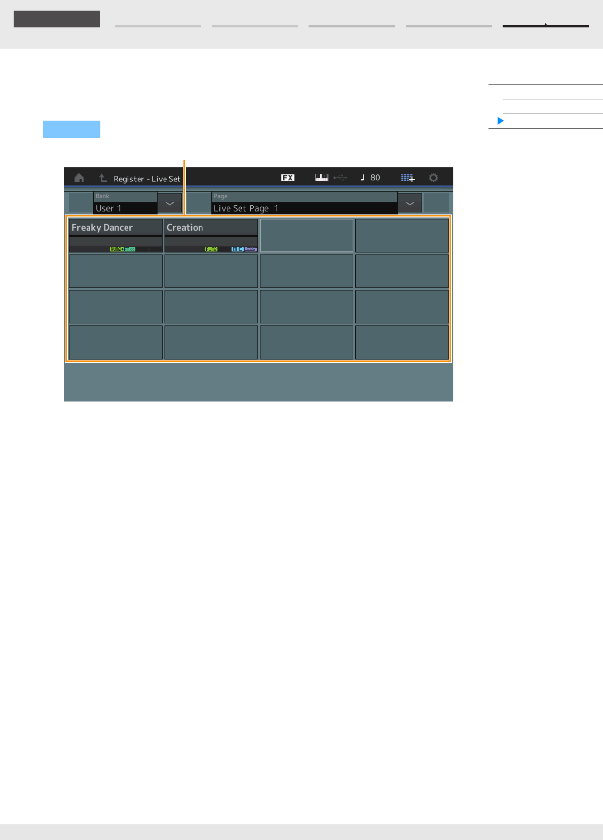 From the Live Set Register display you can register Performances to the Live Set. For basic instructions on