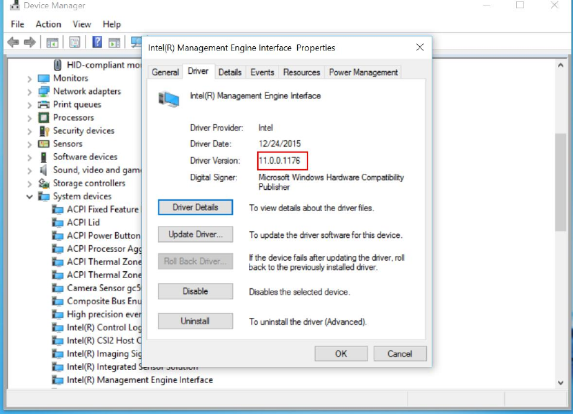 Interface. Check the version number of Intel(R) Management Engine Interface driver.