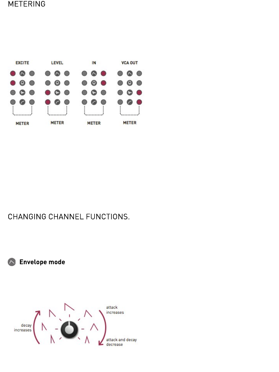 This mode operates as a dynamics compressor. It requires the channel VCA response curve to be set to