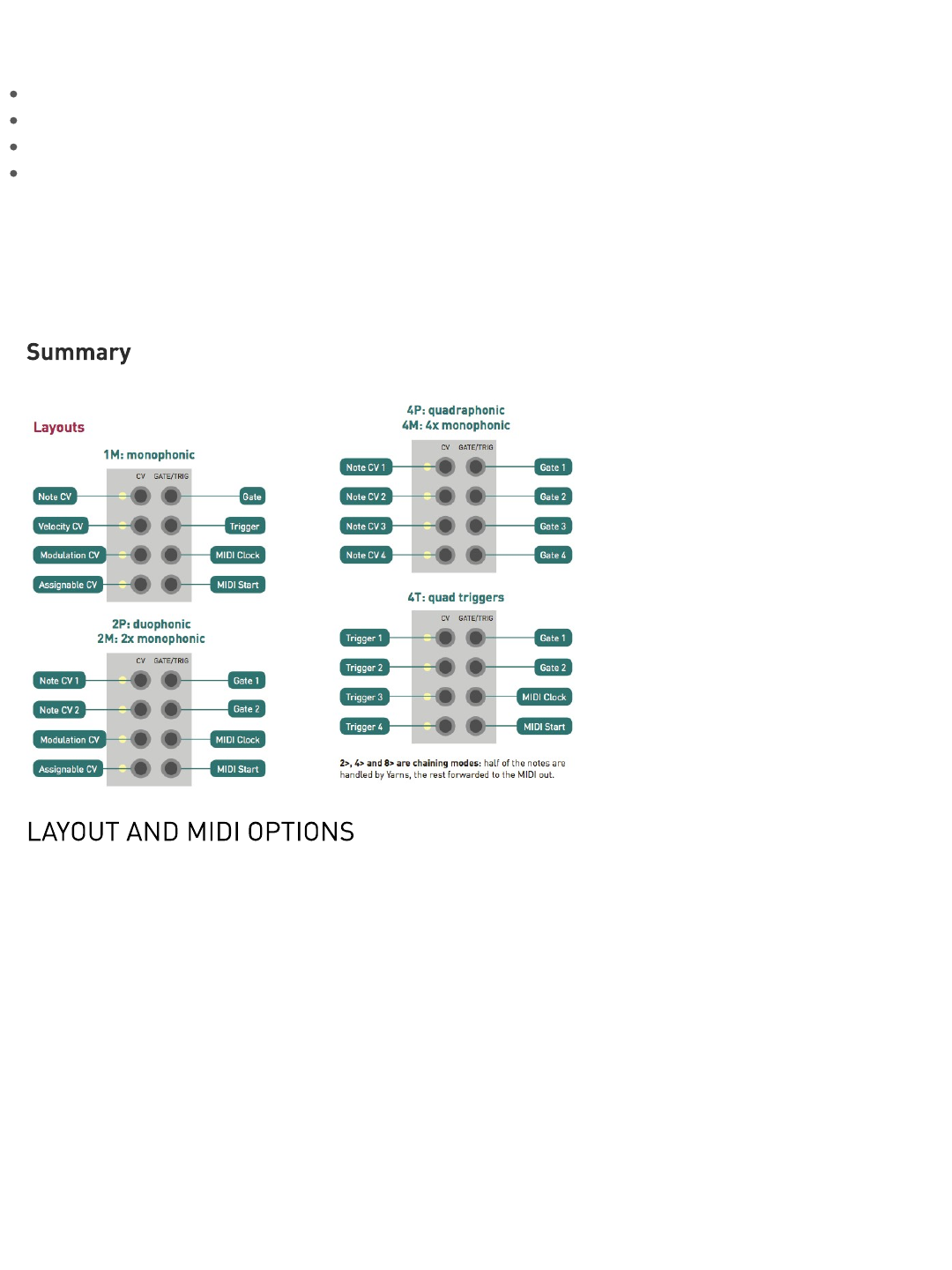 In four-voice layouts (4M, 4P and 8>), the 4 CV outputs are assigned to each voice’s V/Oct note. The 4