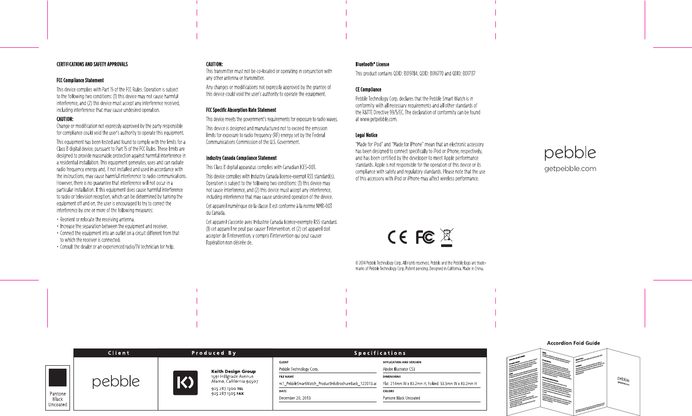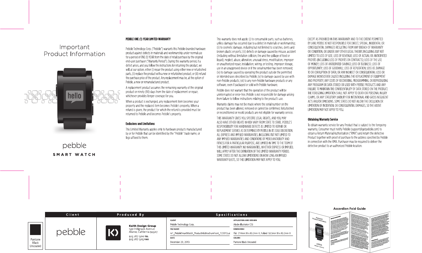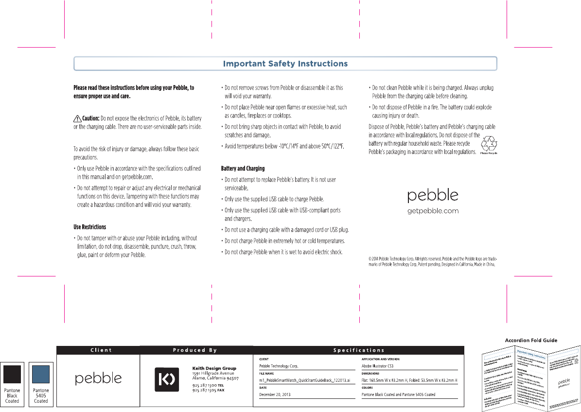 Pebble Technology Corporation Smartwatch m1 PebbleSmartWatch QuickStartGuideFront 122013