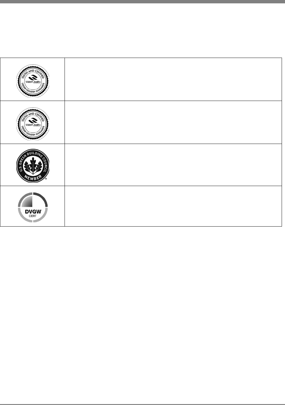 ANSI61 for material safety and tested according to NSF/ANSI 42 for structural integrity