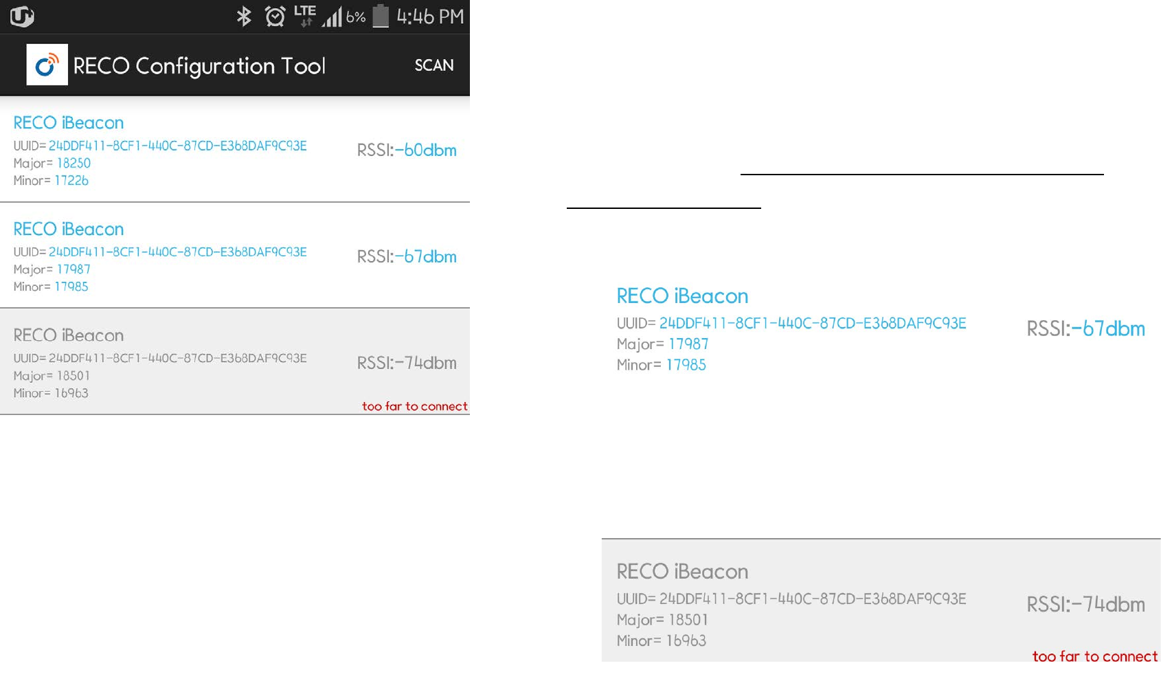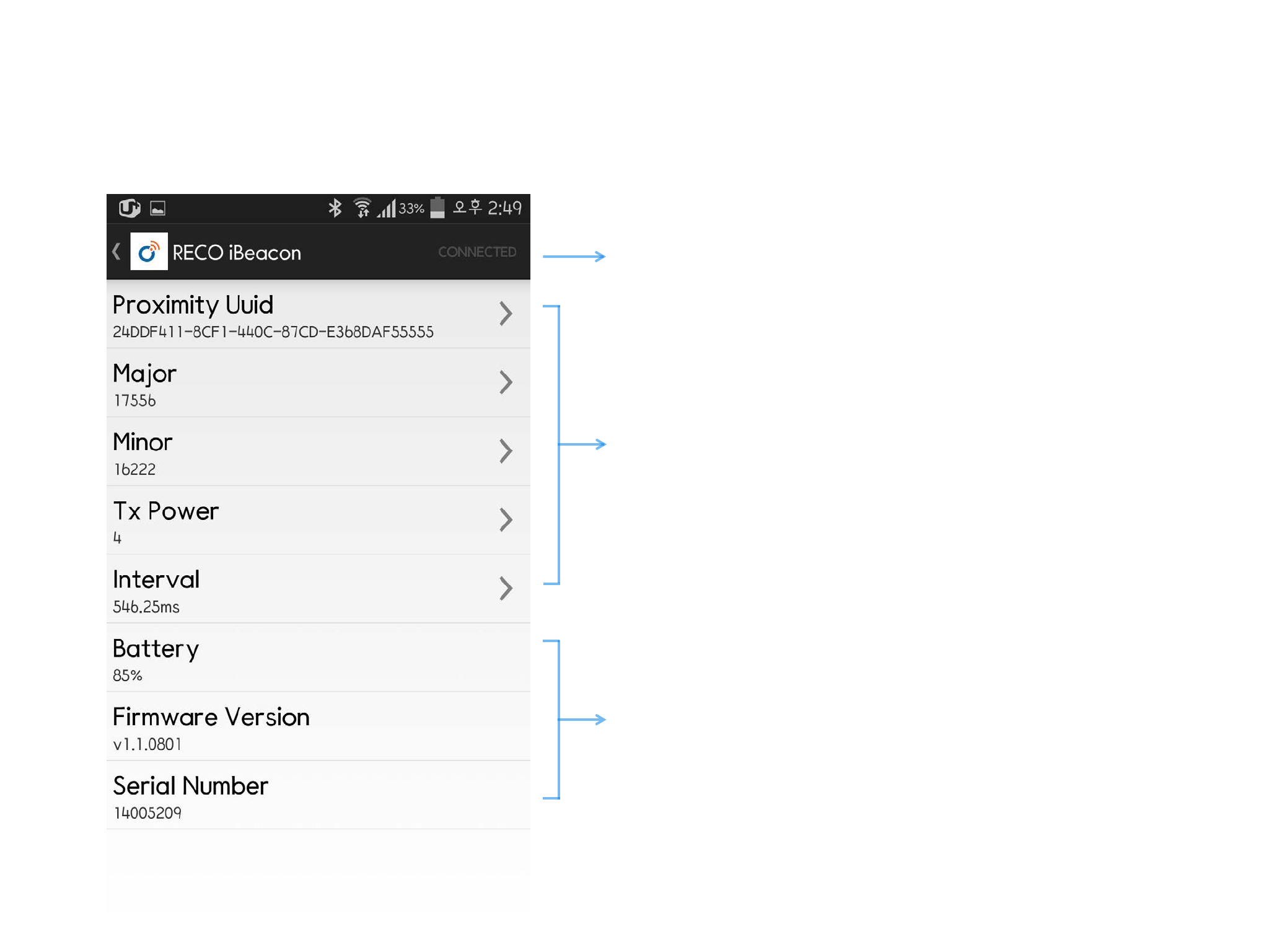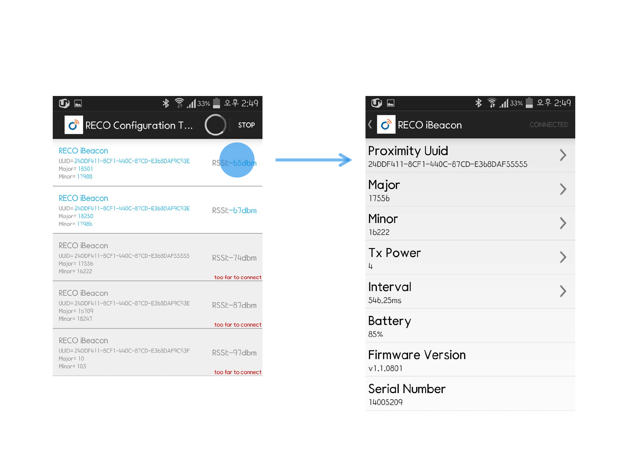 RECO’s UUID, Major, Minor, Tx Power, Interval data can