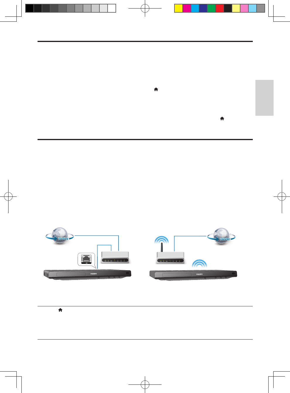 1 Conecte el reproductor a Internet a través de una conexión con cables (Ethernet) o inalámbrica.