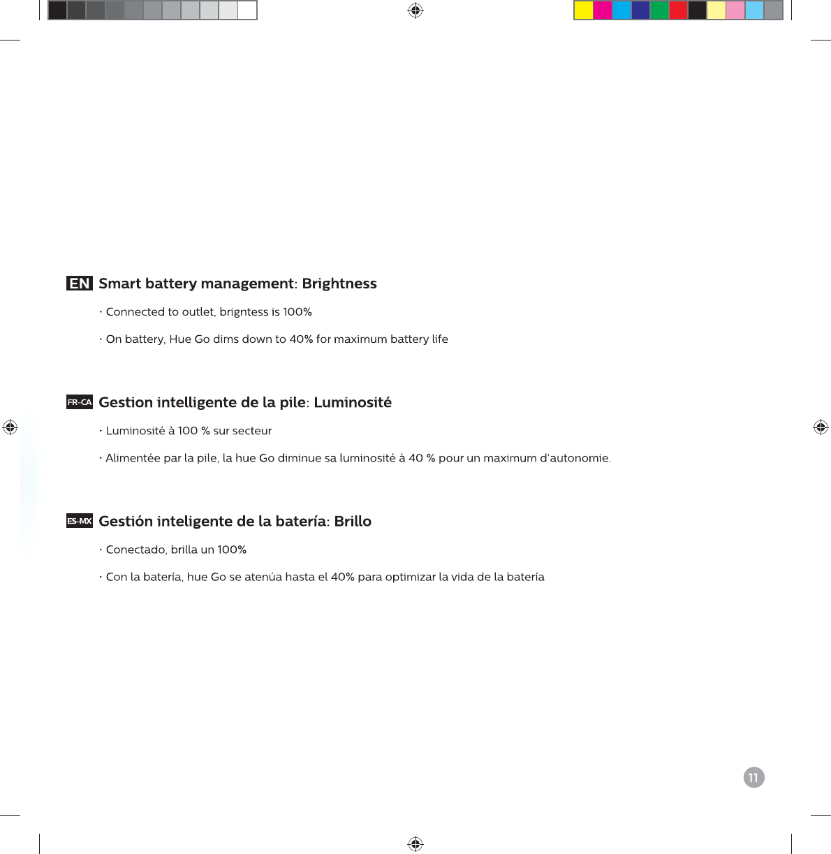 • hue Go se desactivará automáticamente después de 2 horas en modo de suspensión para ahorrar batería.