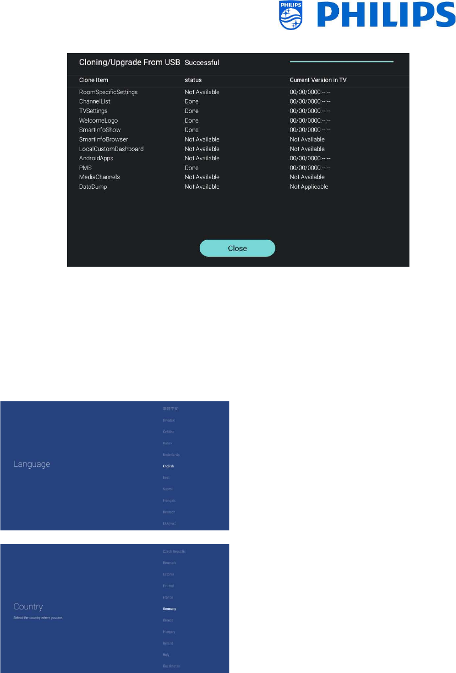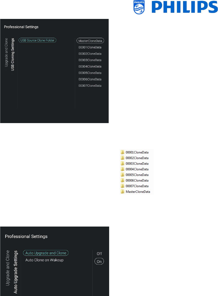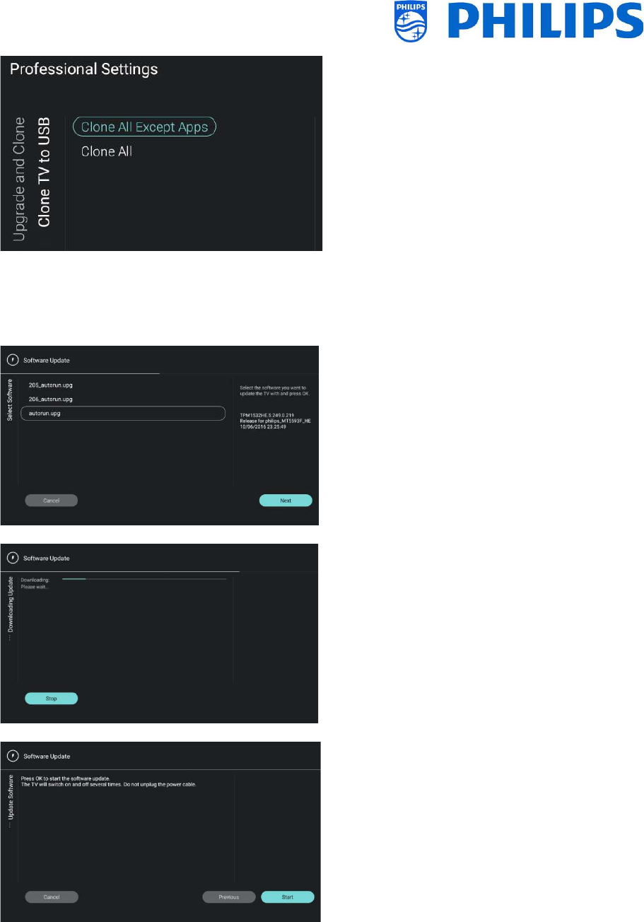Put the USB device in the TV and [Clone USB to TV] in the professional menu