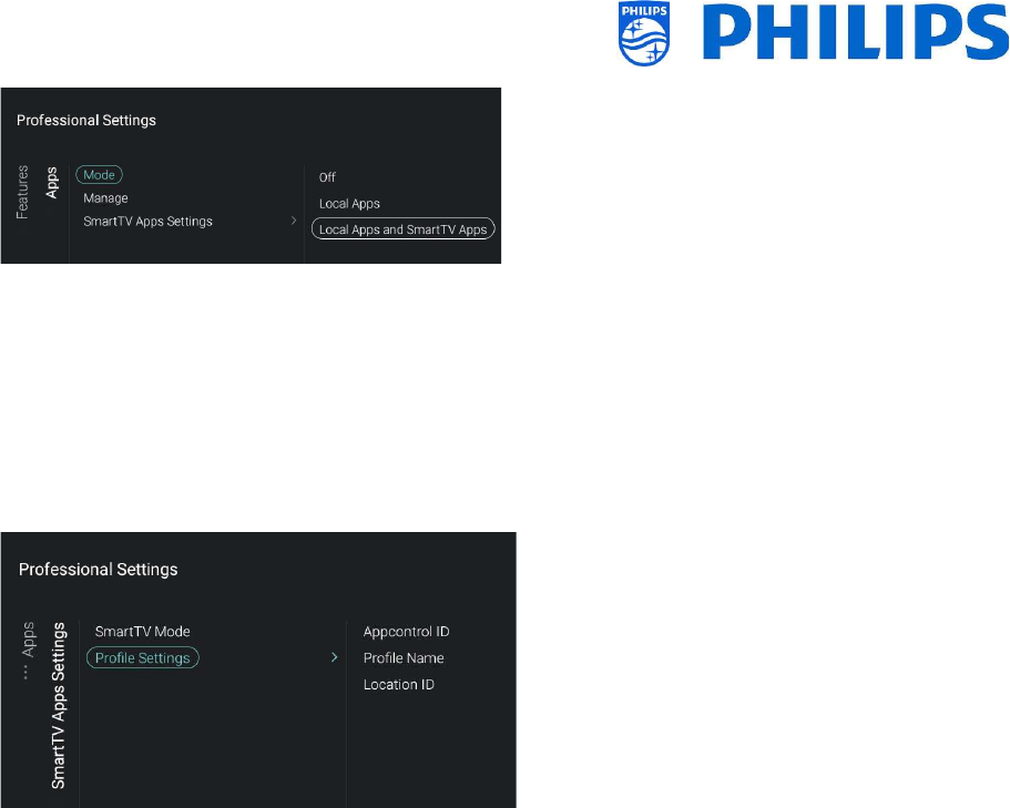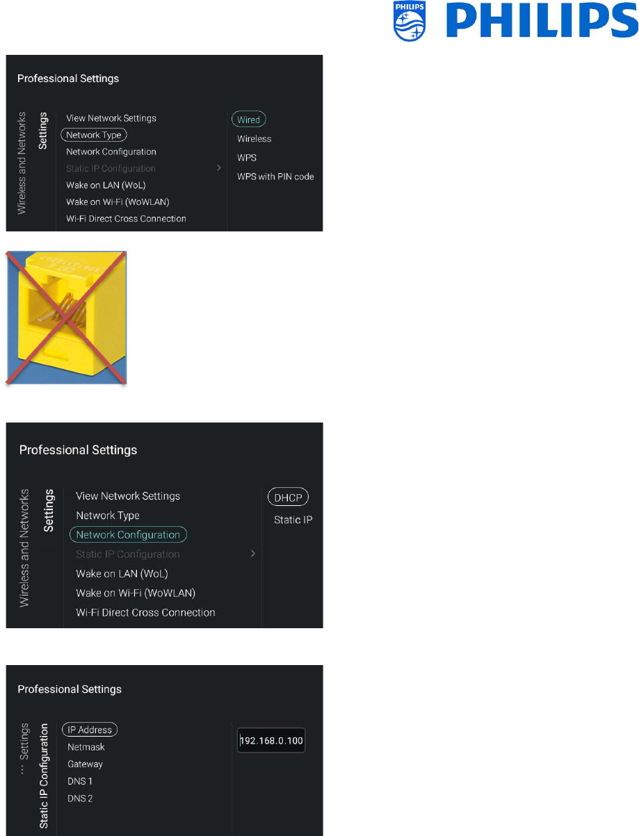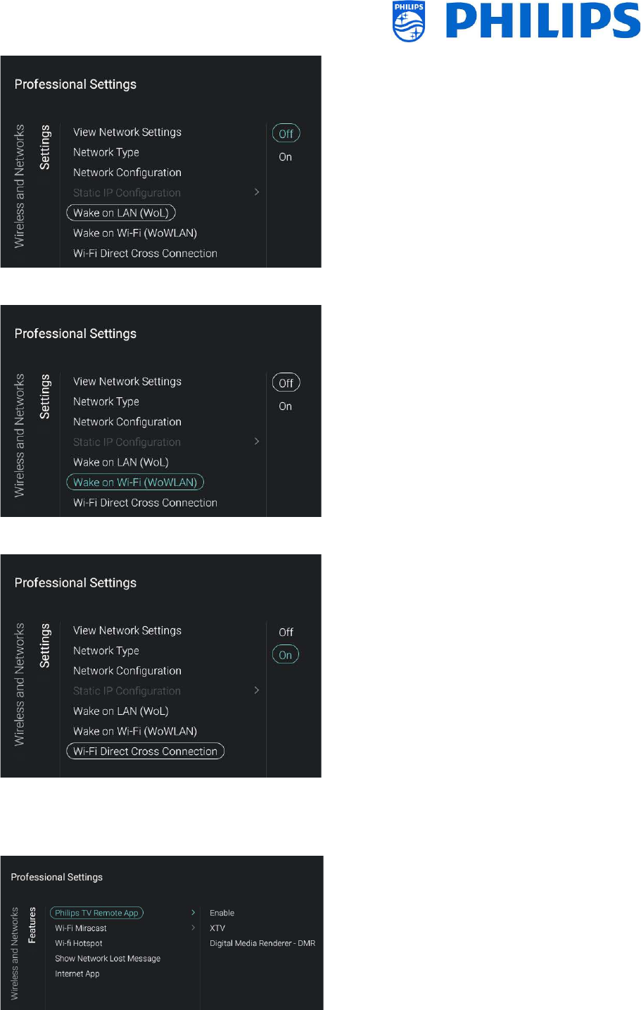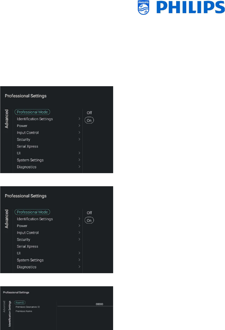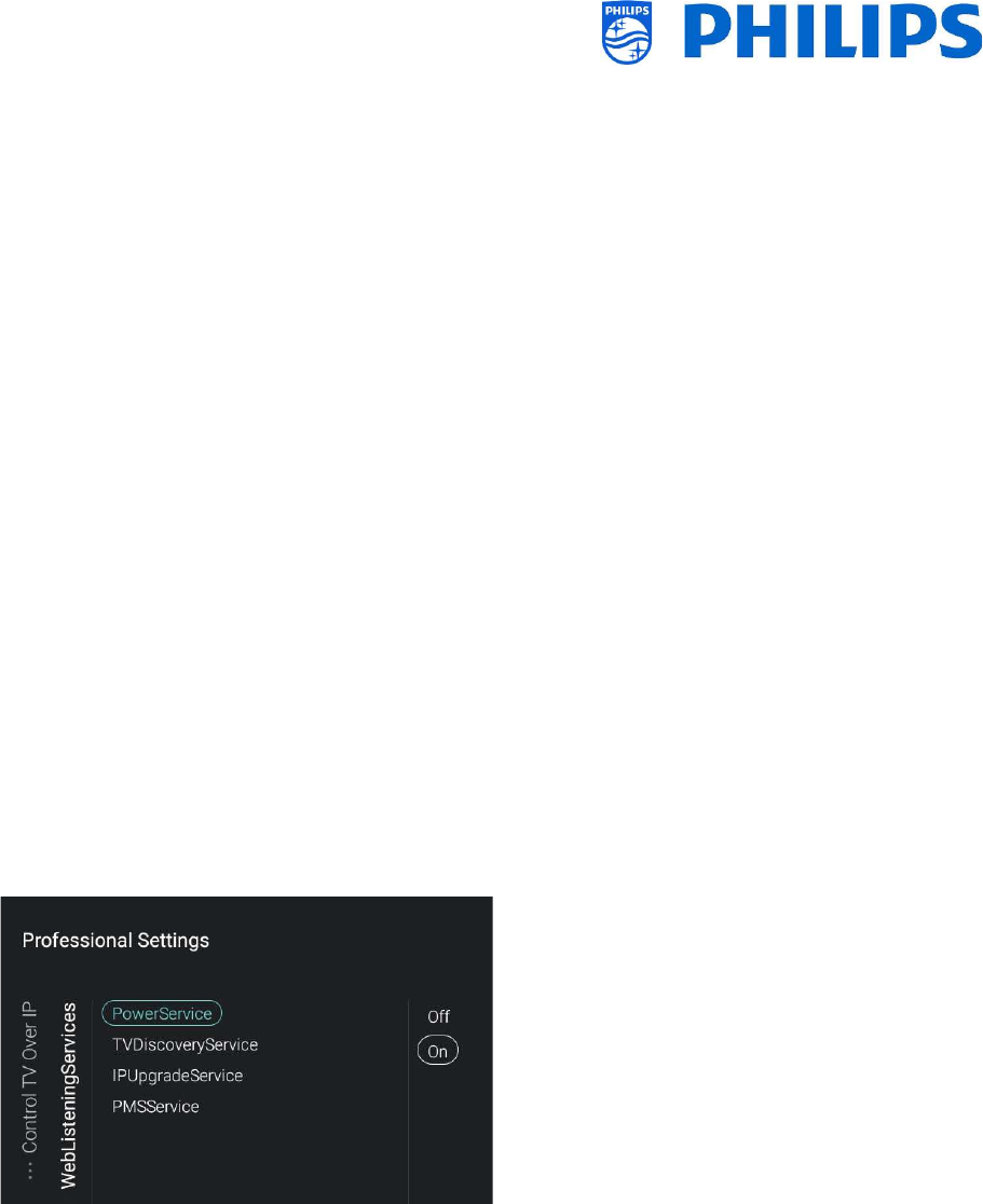 Go to [Wireless and Networks] [Control TV Over IP] in the professional menu and set: