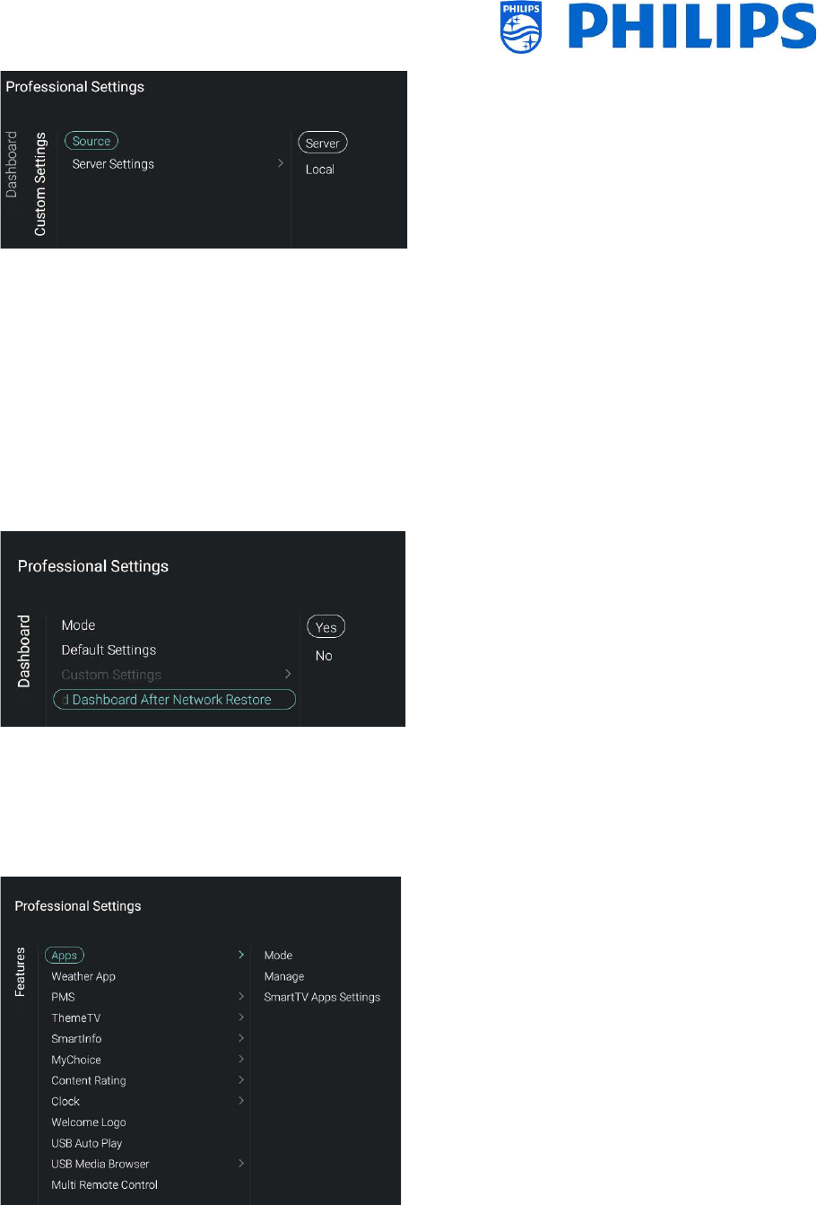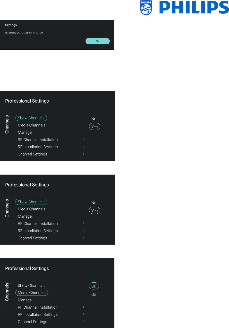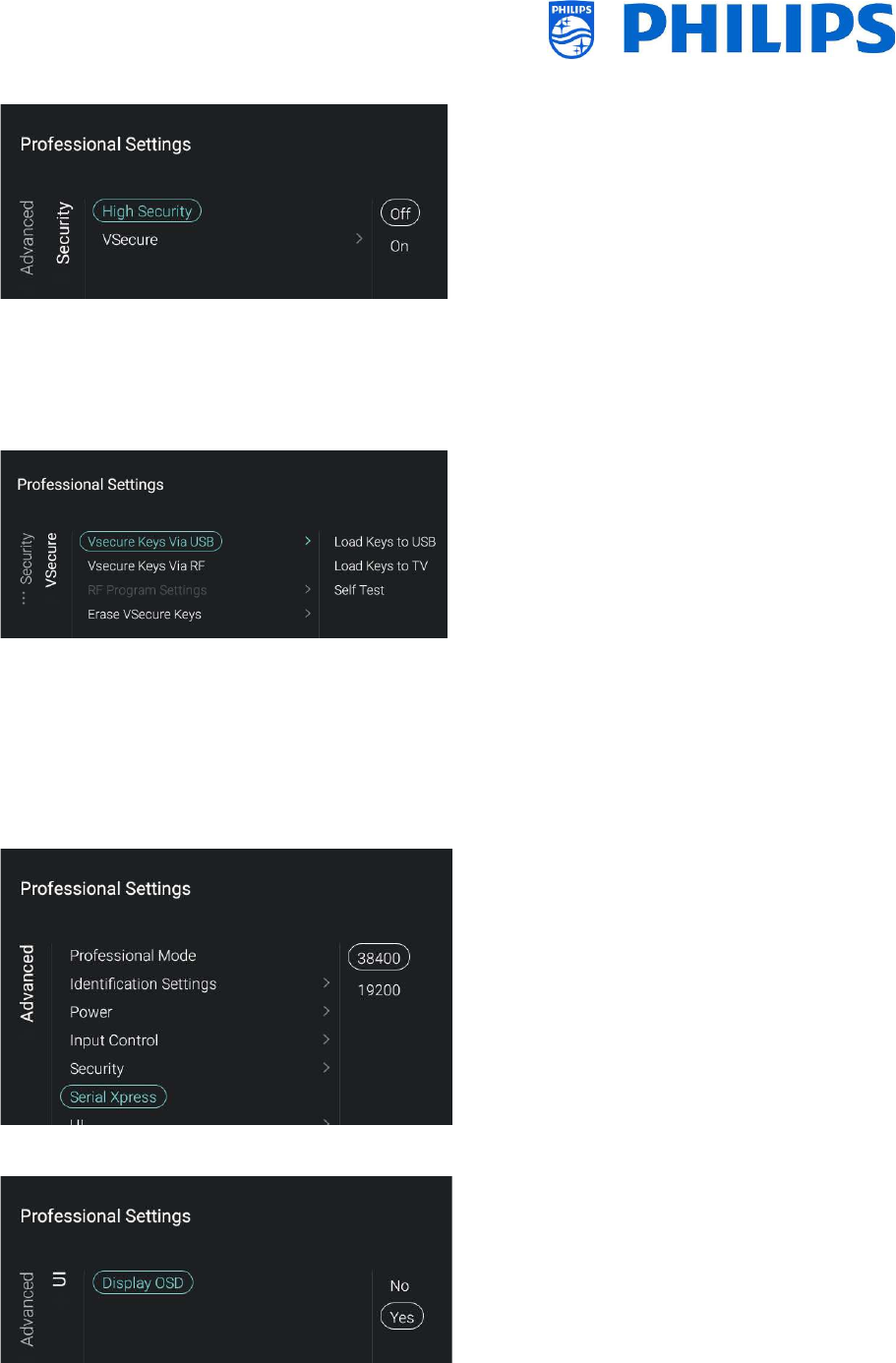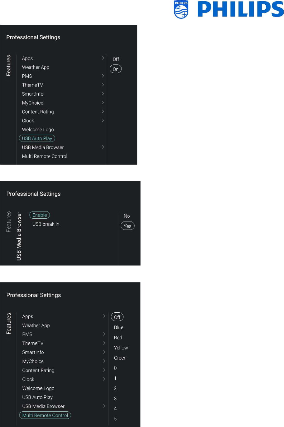 Go to [Wireless and Networks] [Control TV Over IP] in the professional menu and set: