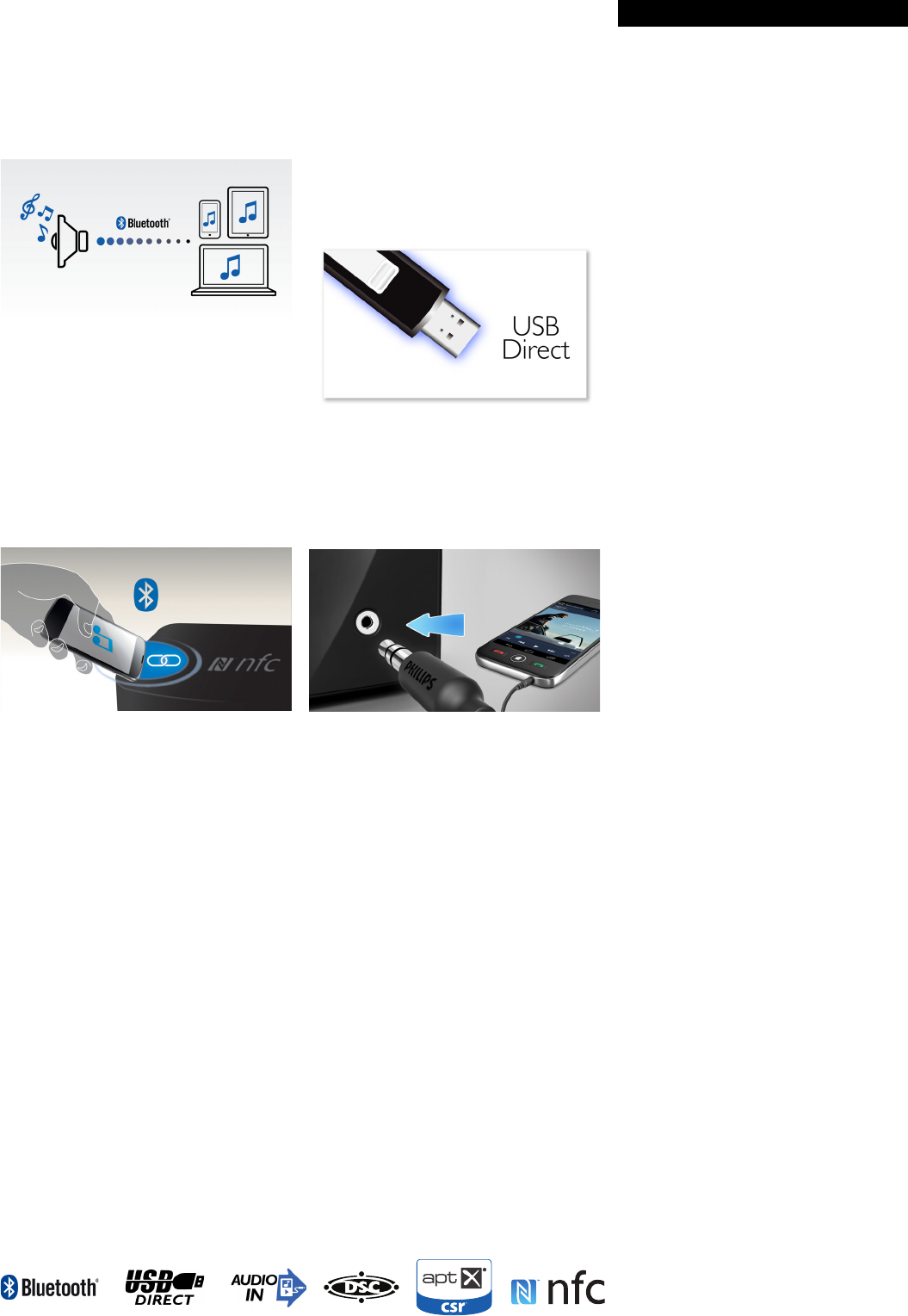 NFC pairing, plus a digital FM tuner, USB Direct, and Audio-In, all in this Philips music