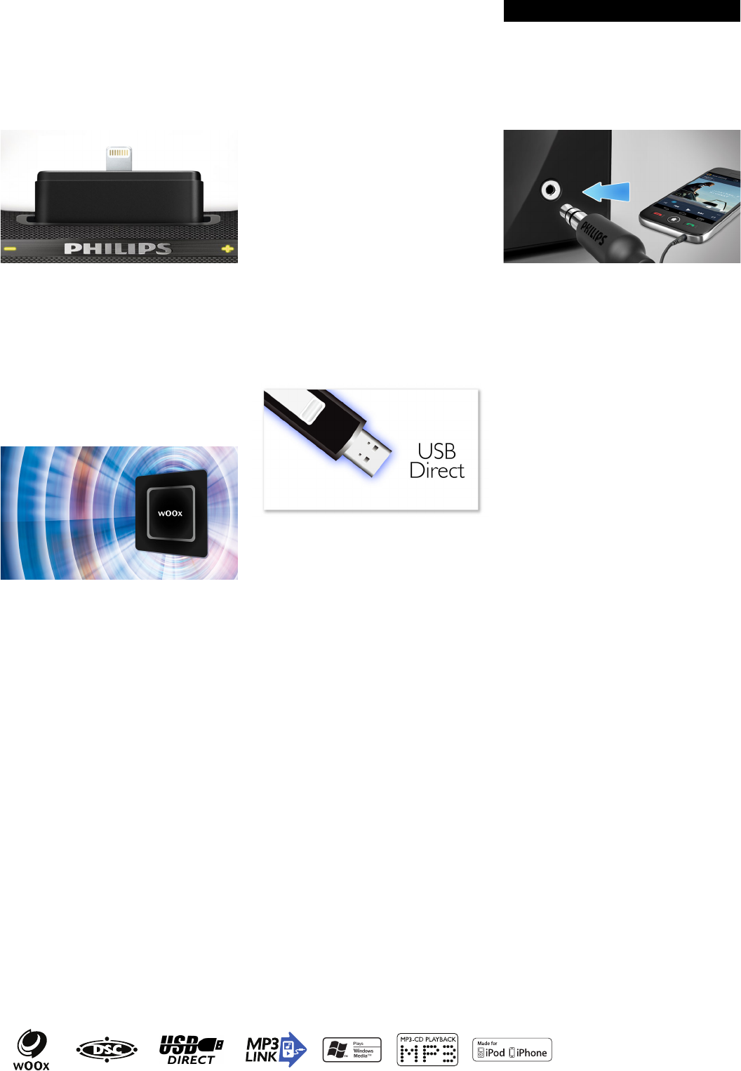 Compatível com o conector Lightning do iPhone 5, este micro system Philips com