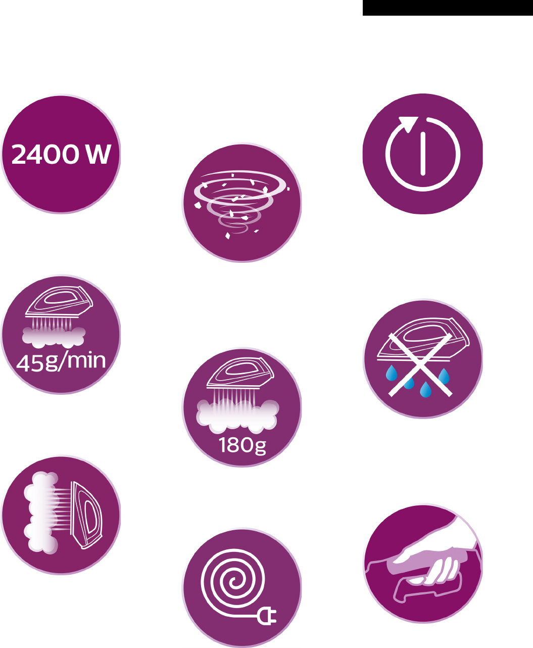 2400 W 45 g/min continuous steam, 180 g steam boost, SteamGlide soleplate