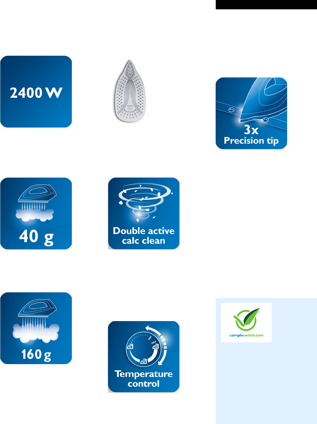 Steam 40g/min;160g steam boost SteamGlide Plus soleplate, Anti-calc, 2400 Watts
