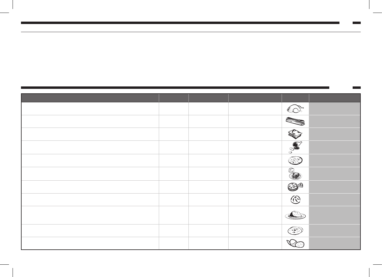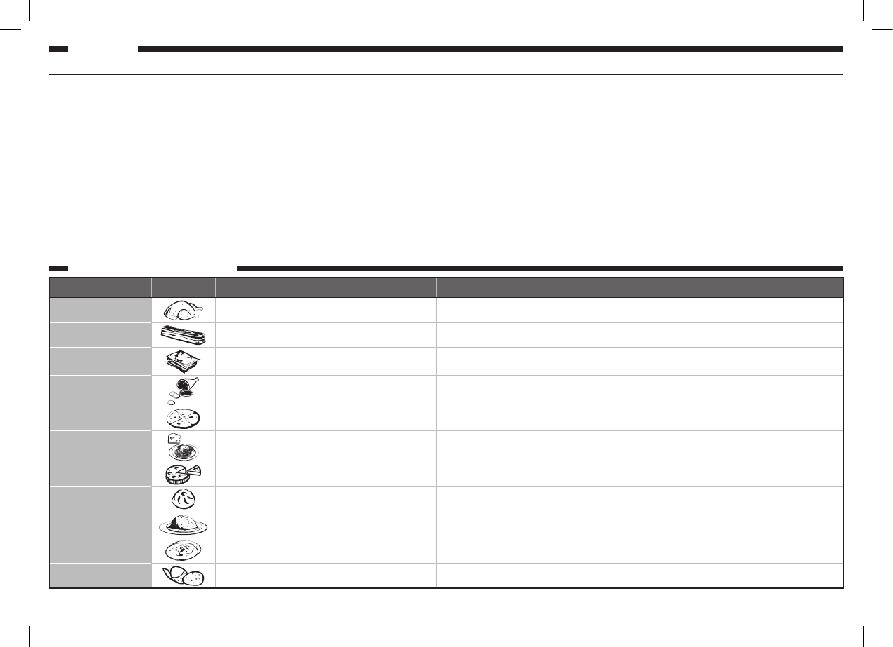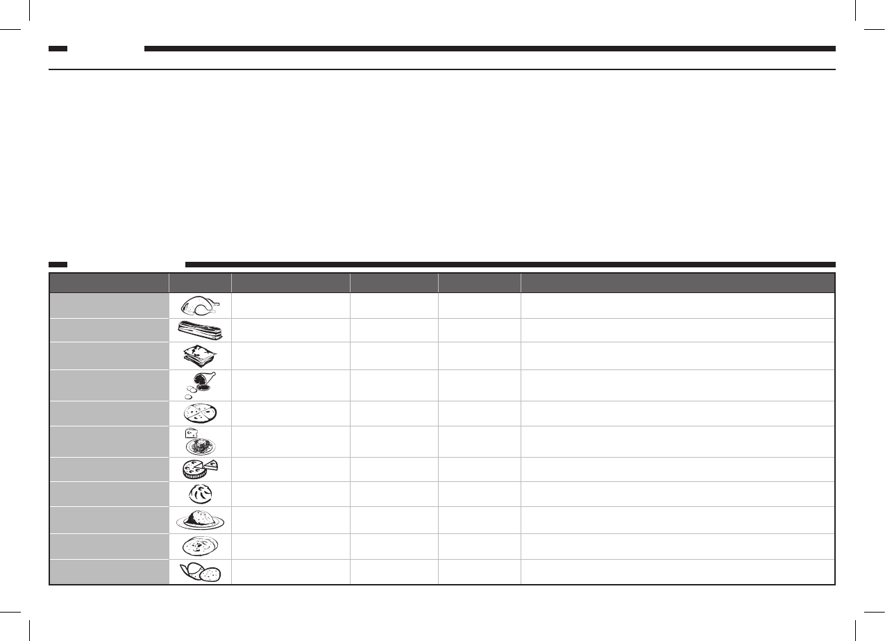 Dish Min-max amount Cooking time  Temperature Hints, Tips