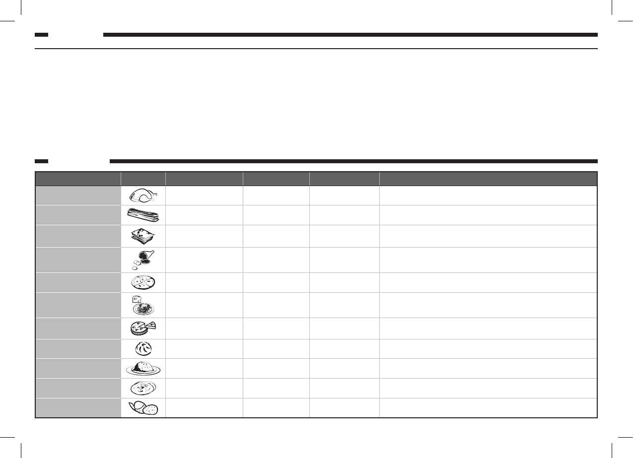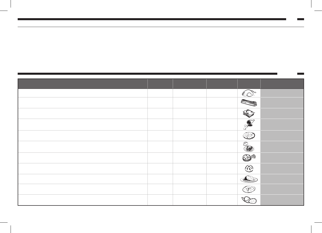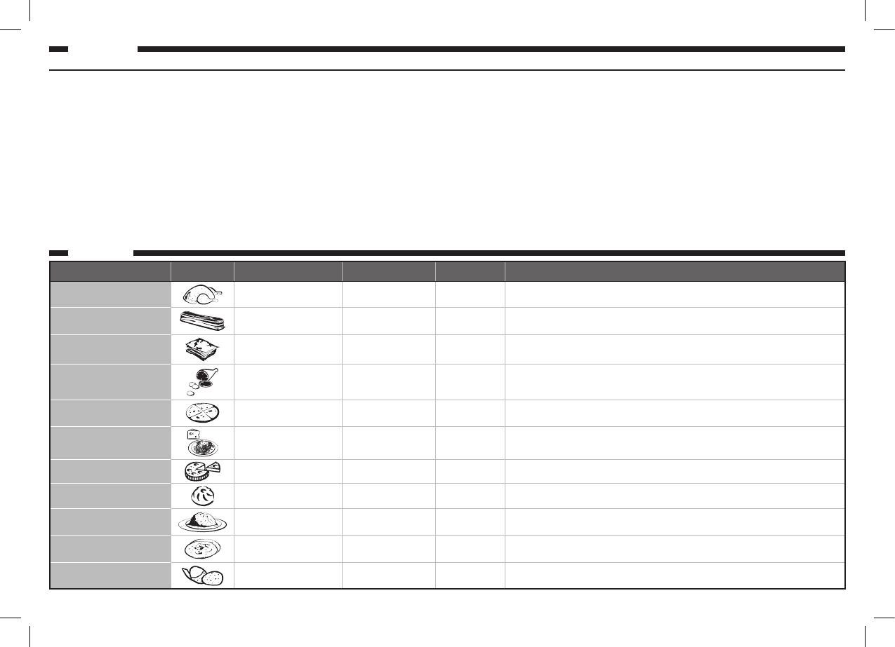 Dish Min-max amount Cooking time  Temperature Hints, Tips