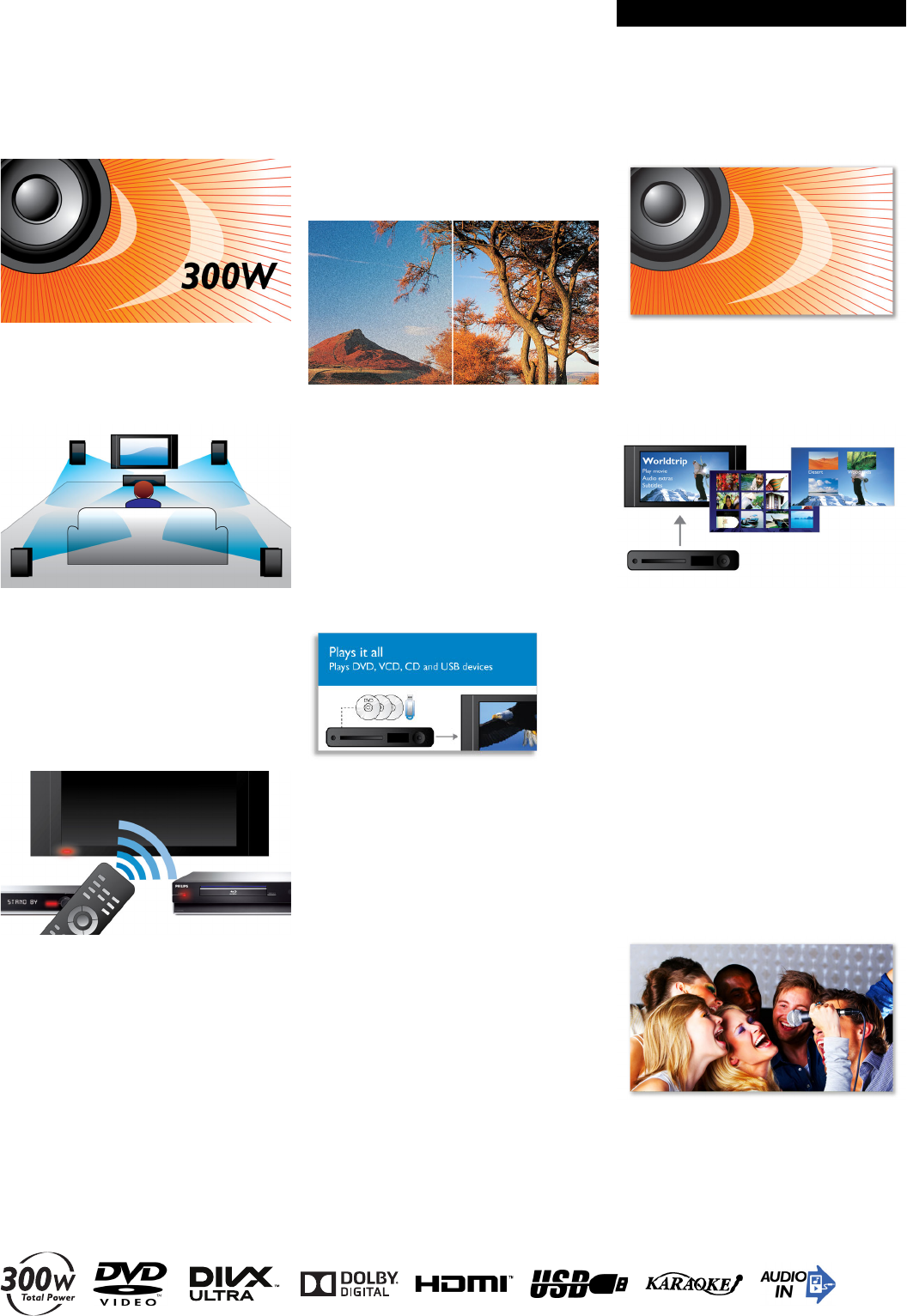 speaker drivers offering 300-W powerful surround sound and DVD video upscaling to