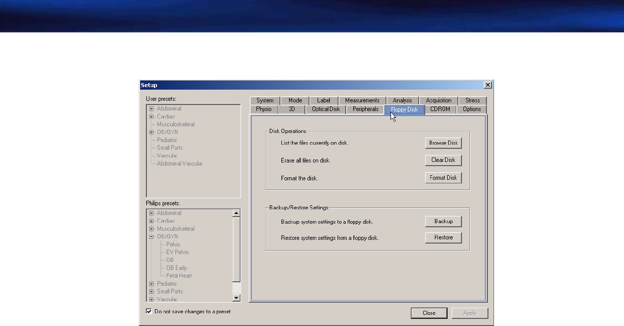 presents software procedures for backup and retrieval of customer presets, and for reloading or