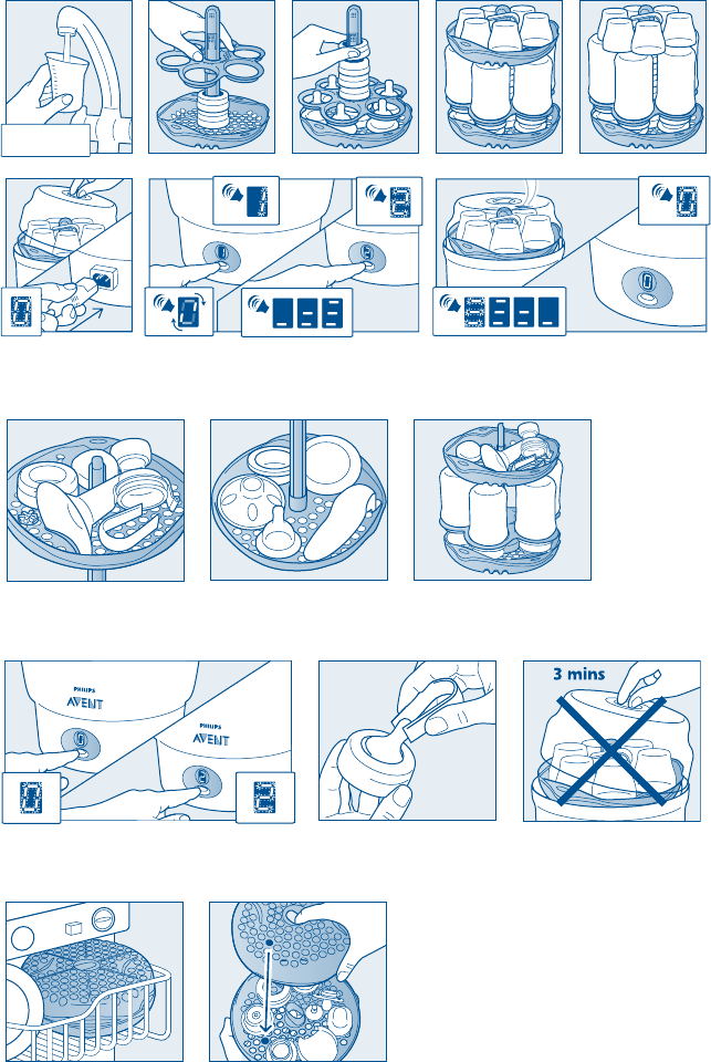 최대 6개의 125ml, 260ml 또는 330ml 아벤트 젖병 소독