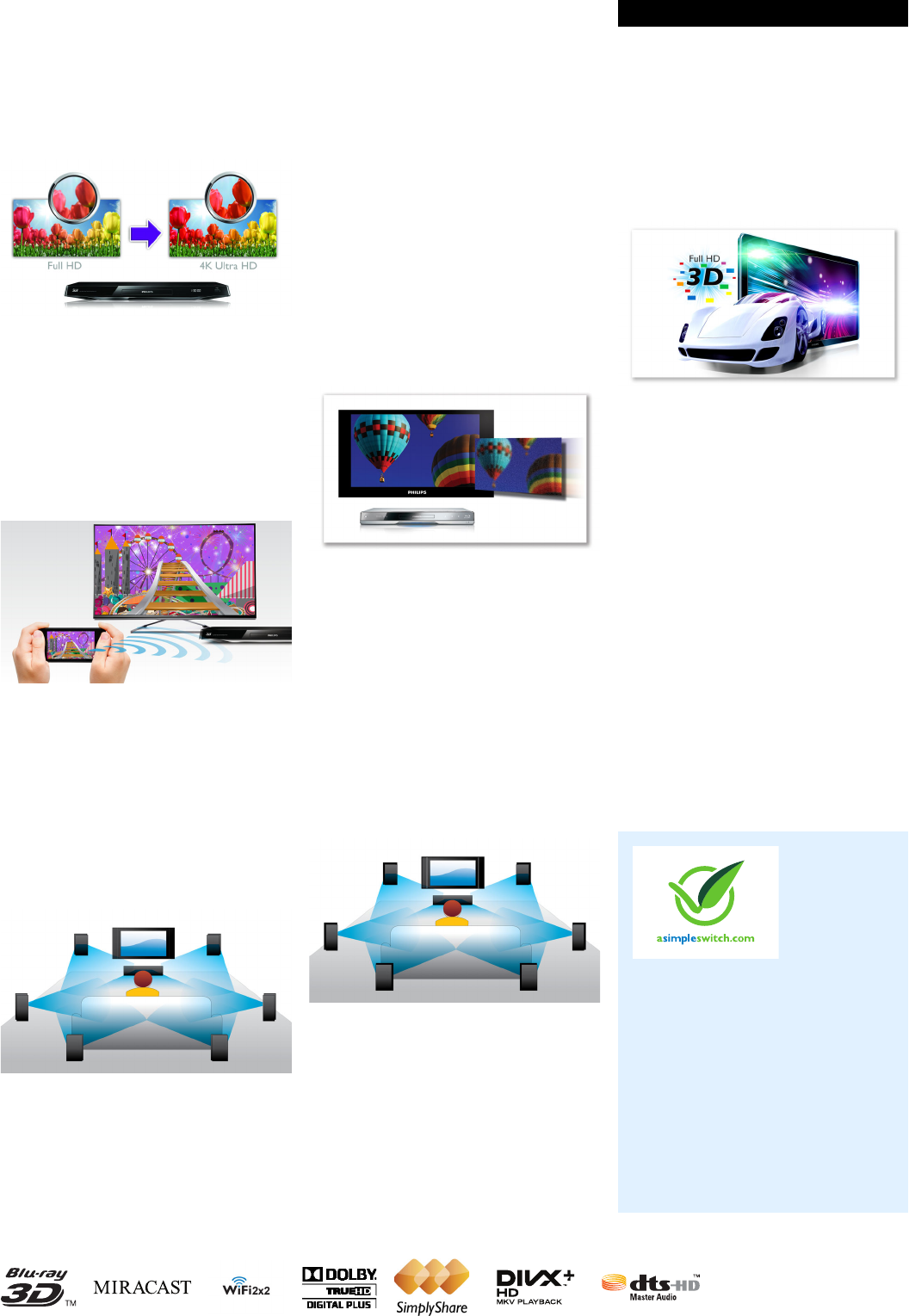Poboljšanje rezolucije na 4K Ultra HD Reprodukcija 3D Blu-ray Disc medija, Miracast™, Ugrađeni WiFi