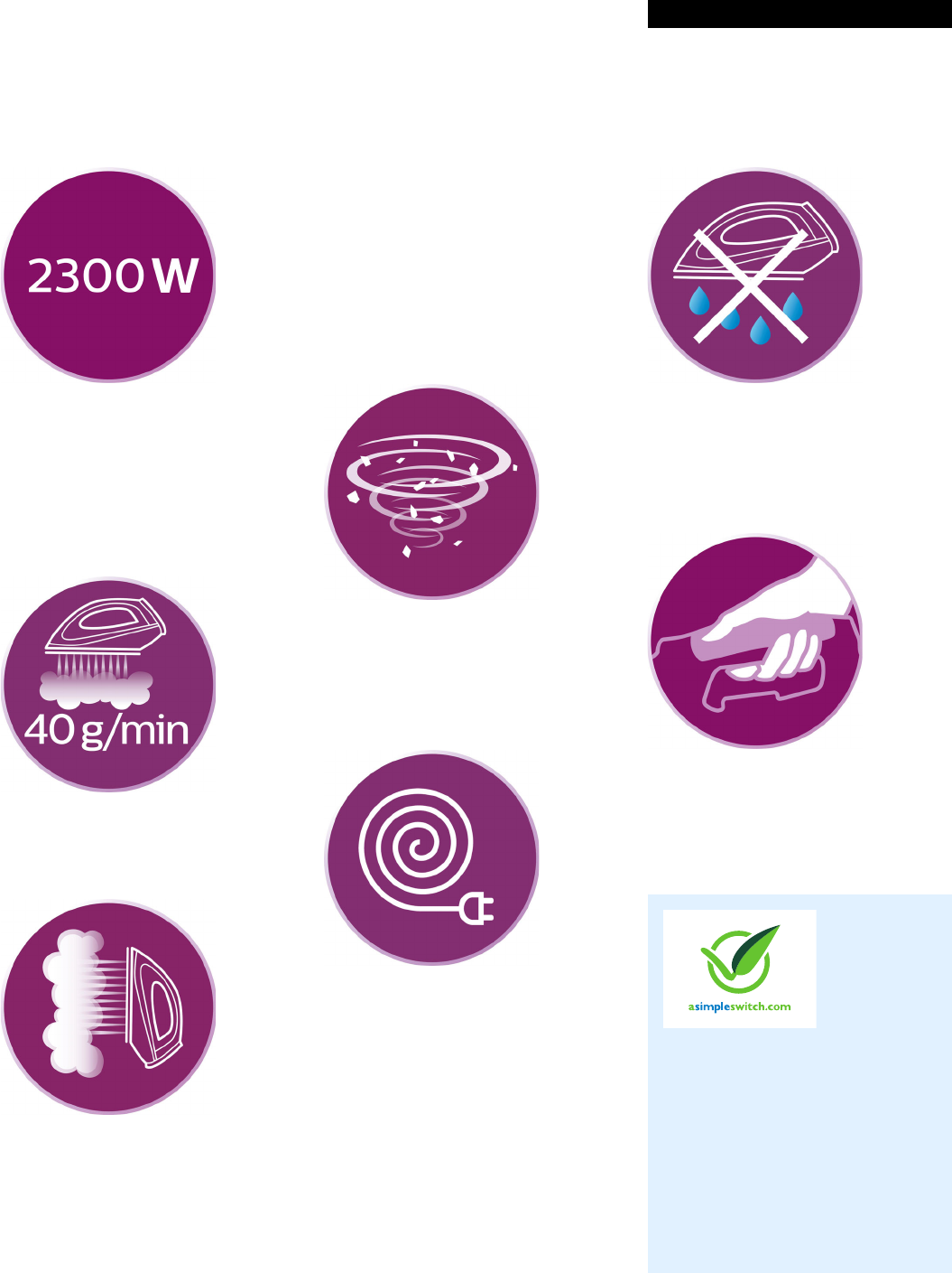 2300 W 40 g/min continuous steam, 145 g steam boost, SteamGlide soleplate