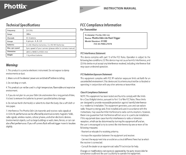 Phottix LITETX Phottix Odin Lite Flash Trigger User Manual