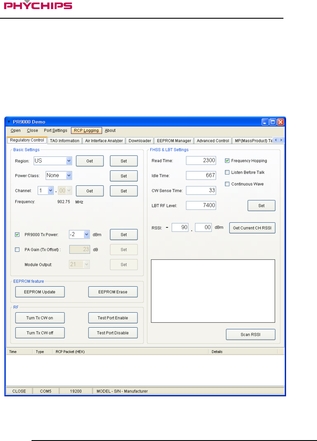 GUI, click the Windows start button, Program menu, Phychips, PR9000 SDK. After start-up, a window will be
