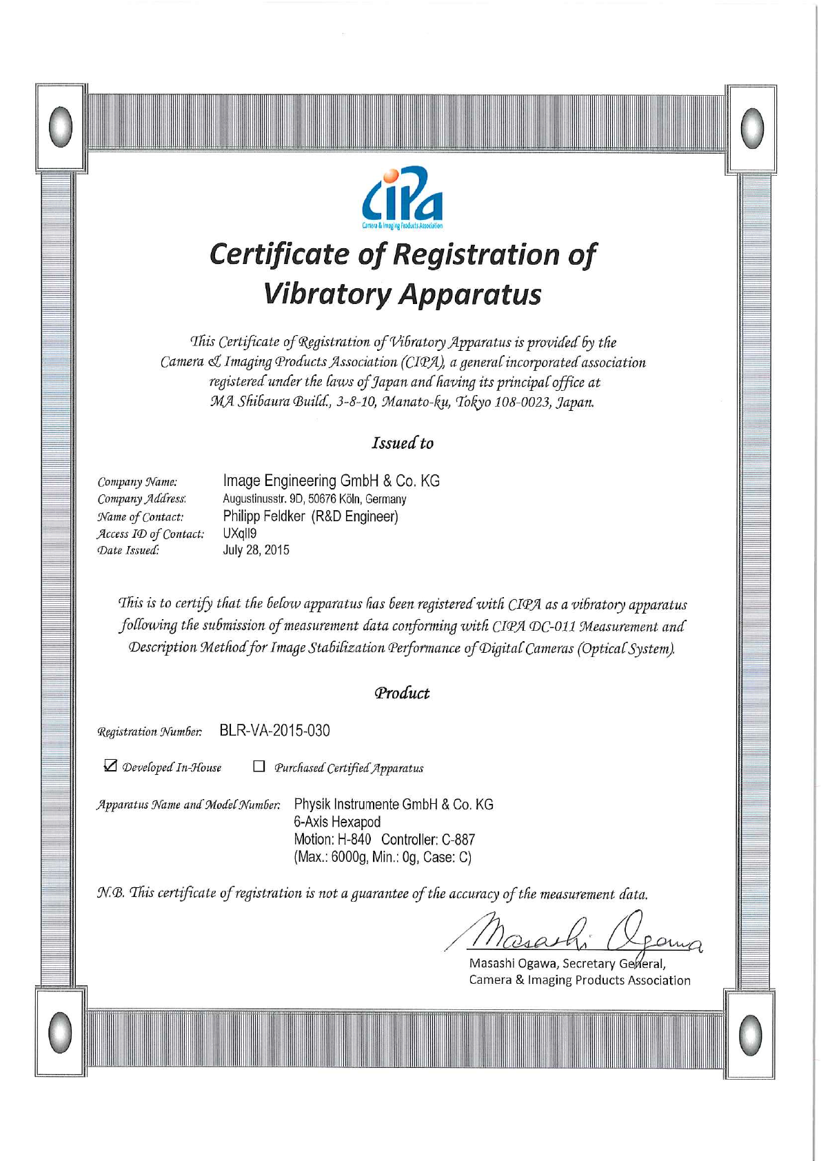 PI_Certificate_of_Registration_of_Vibratory_Apparatus_H-840 Certified Quality