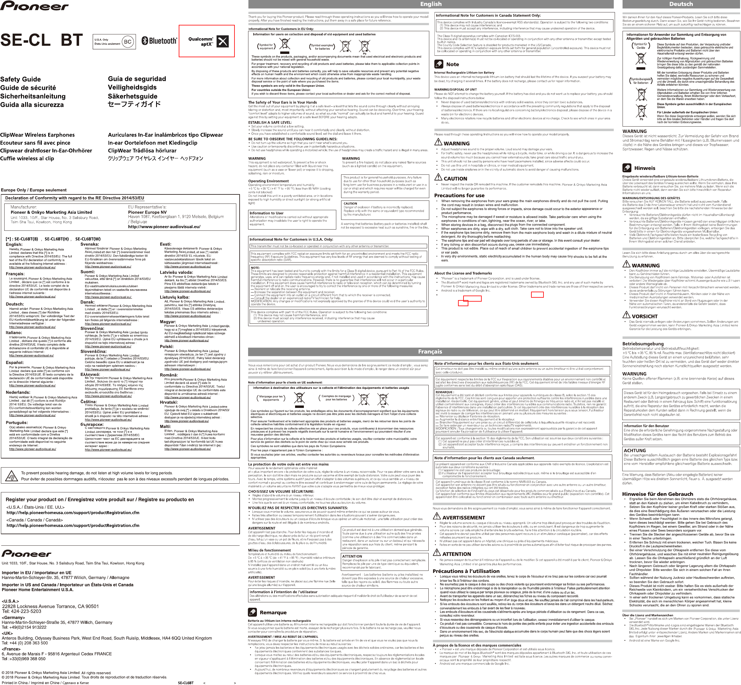 Pioneer and Onkyo Asia SE1250 Pioneer ClipWear Plus Wireless Earphones User Manual SE CL6BT SafetyGuide front V1 0