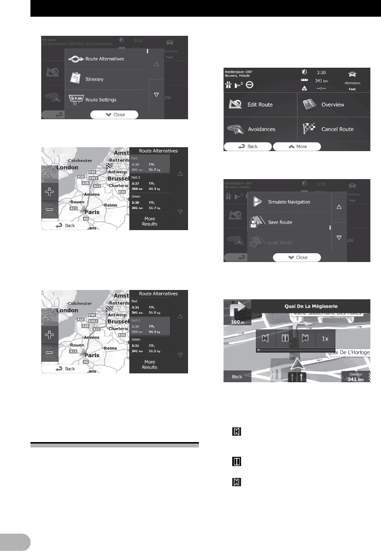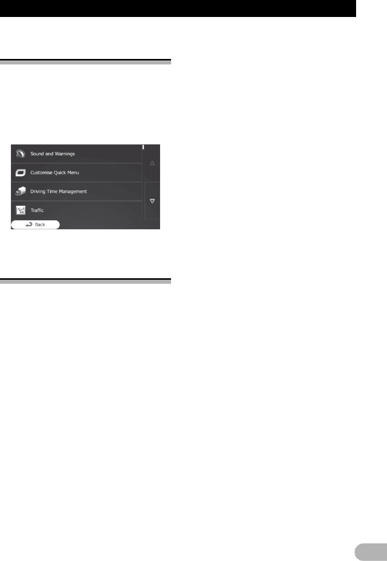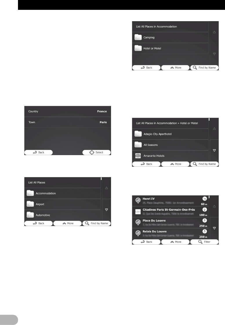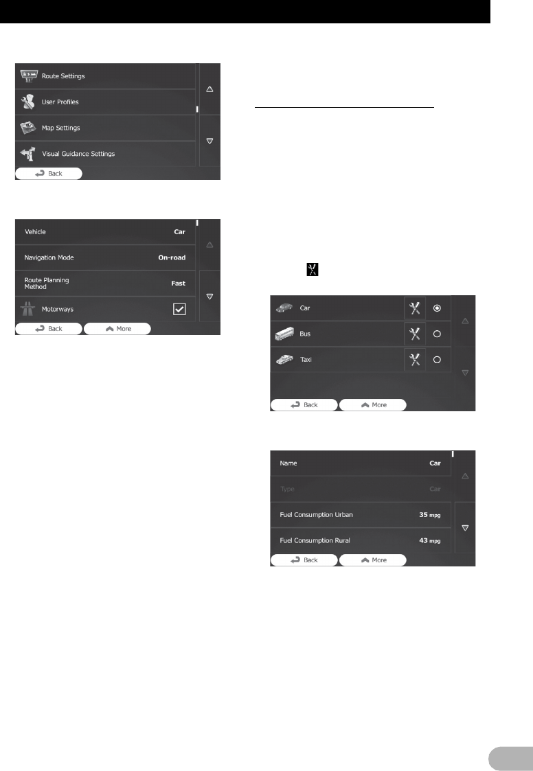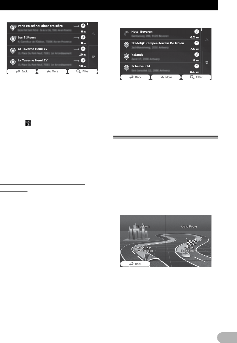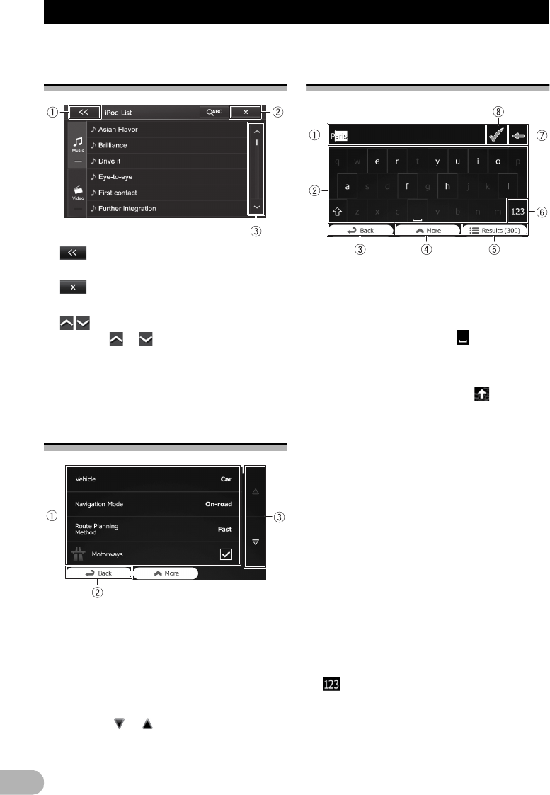- Operating list screens of the navigation function (e.g. route settings screen)