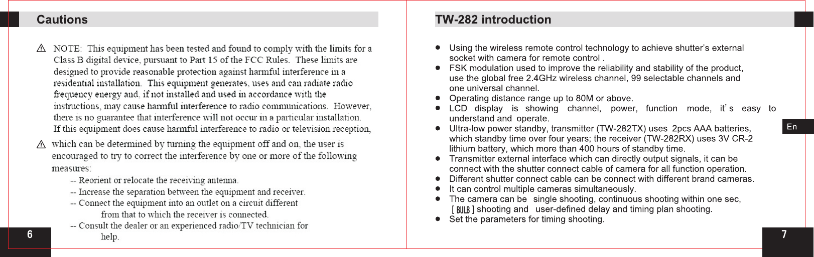 5. Shutter connect cable ---------- 1pc 6. Manual(this manual) ------------ 1pc