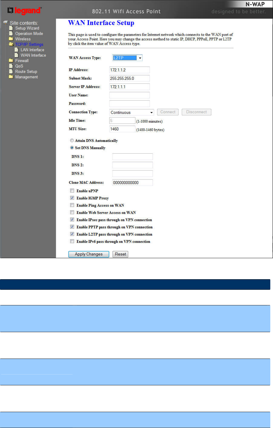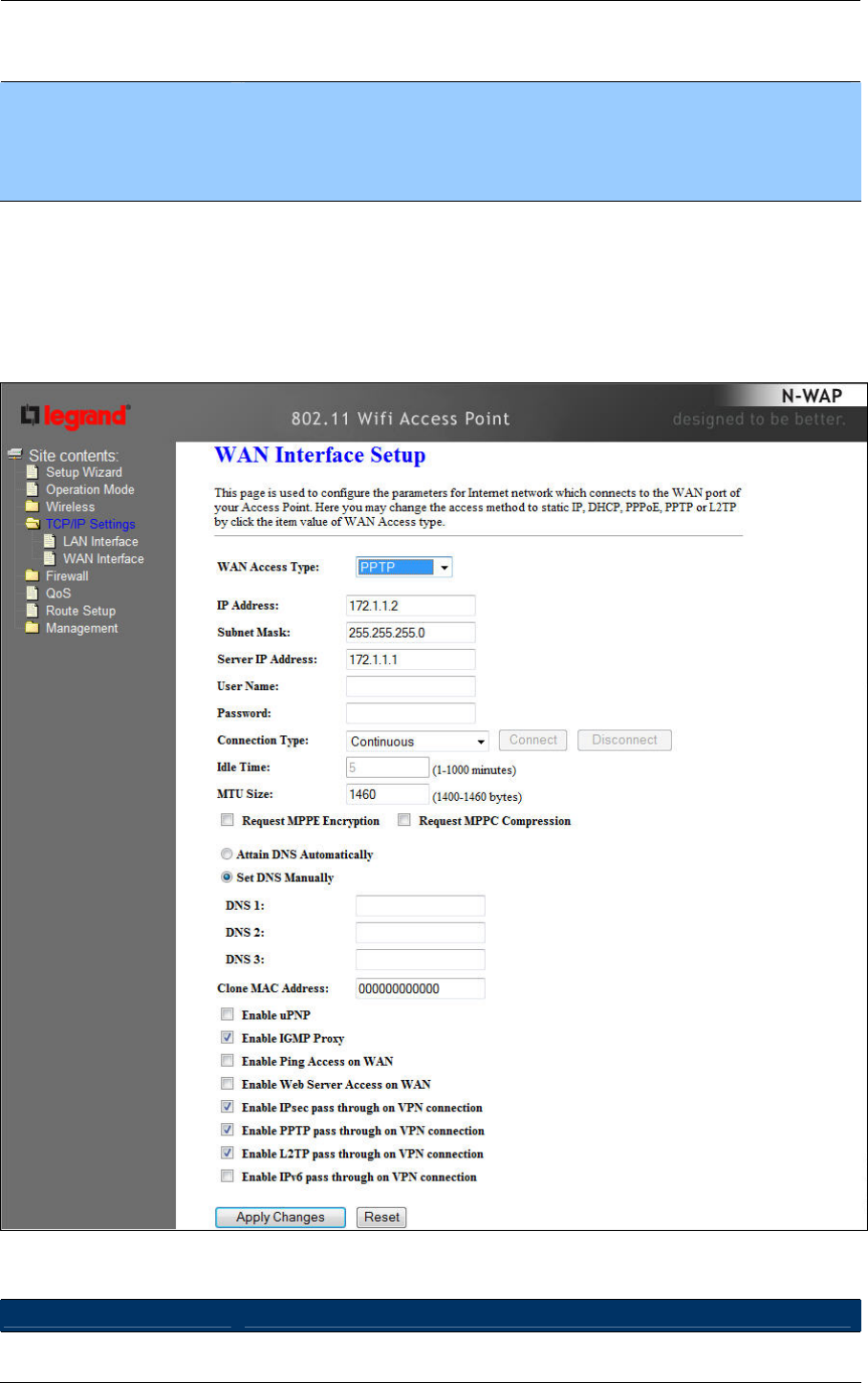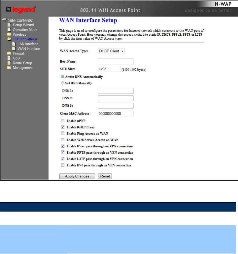 Access Mode Static IP, DHCP Client, PPPoE, PPTP, L2TP