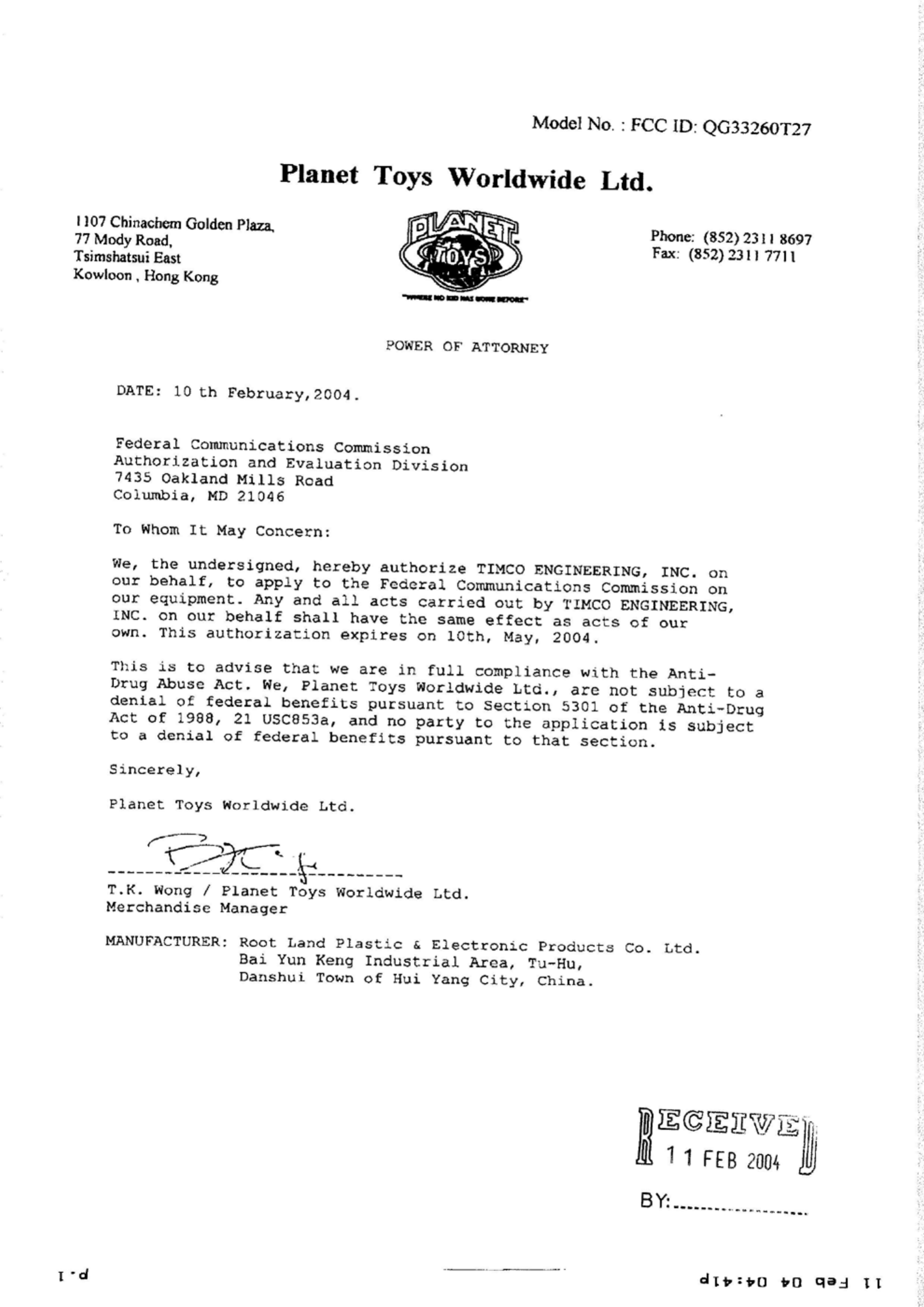 Planet Toys Worldwide Limited 26.96-27.28 MHz WIRELESS R/CTX USERS MANUAL