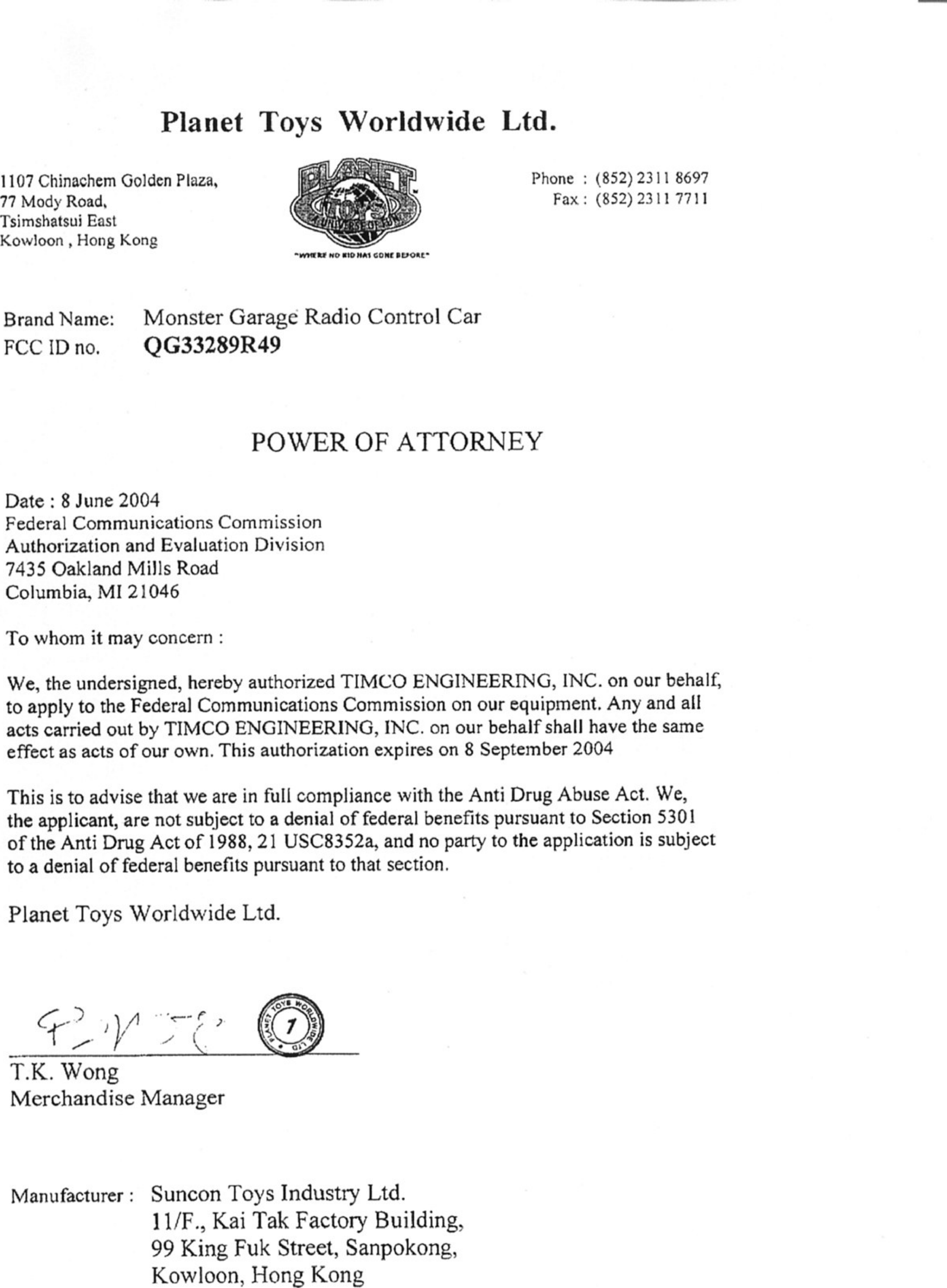 Planet Toys Worldwide Limited 49.82-49.90 MHz WIRELESS R/C TOY - RX