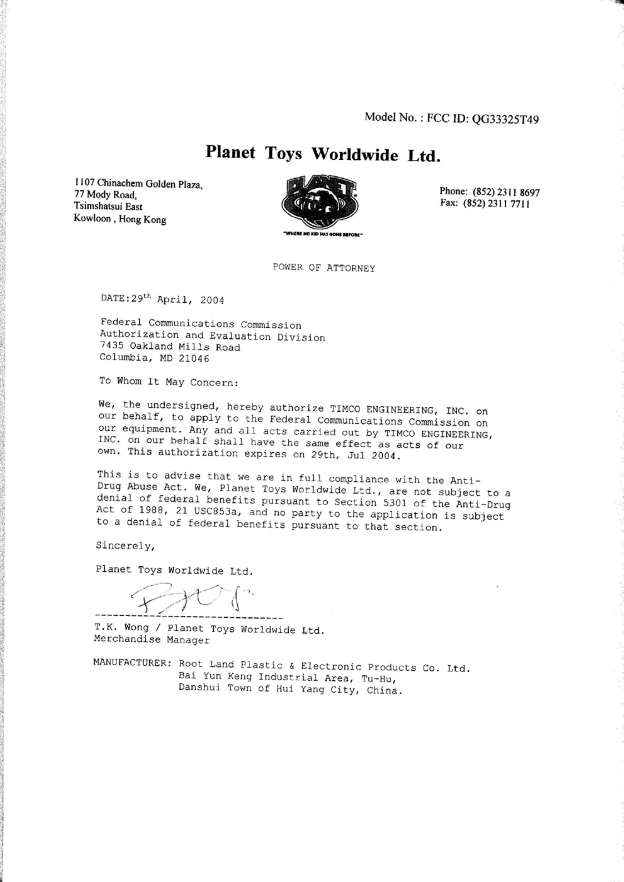 Planet Toys Worldwide 3325T49 49.82-49.90 mhz wireless r/c - tx User Manual users manual