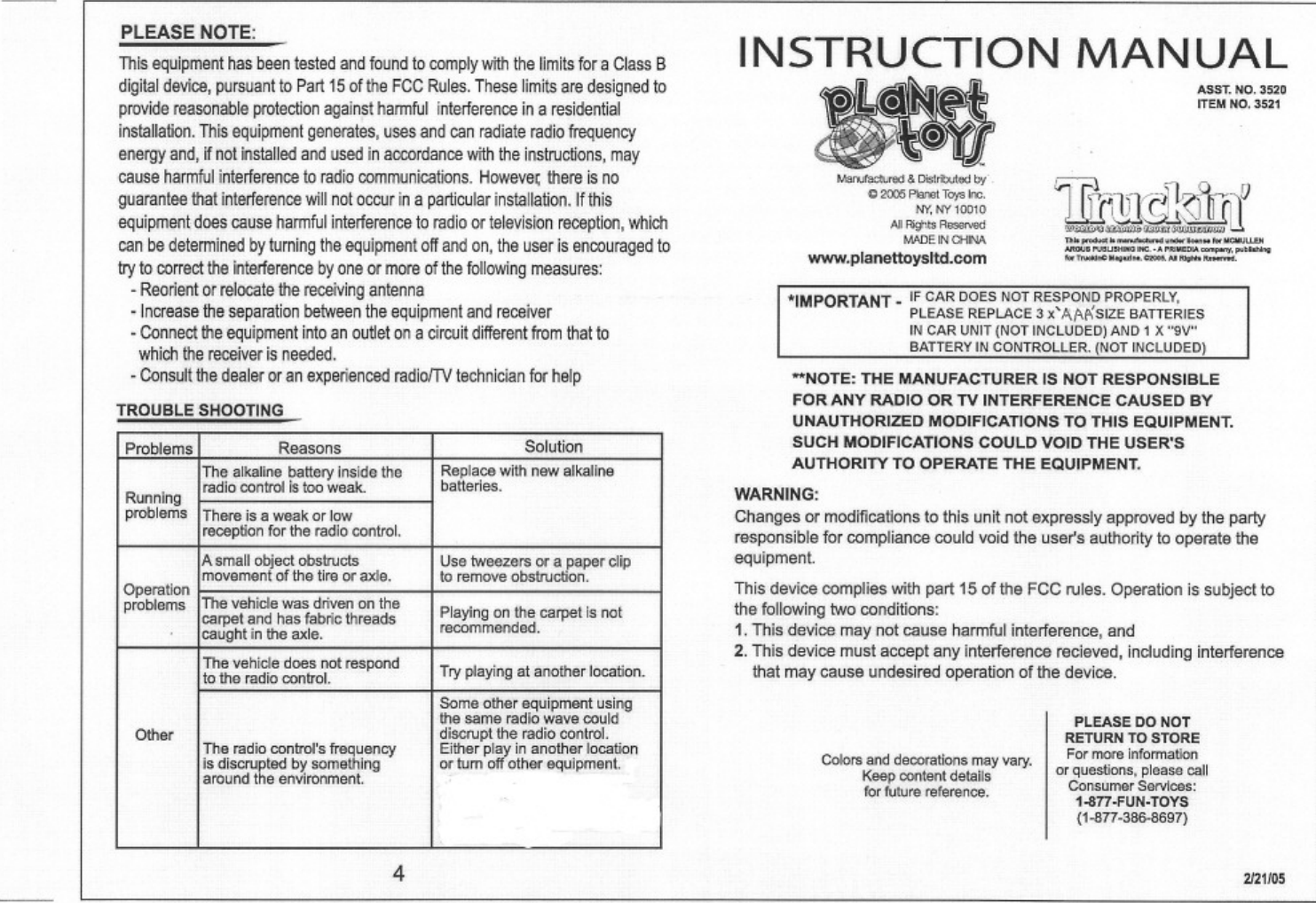 Planet Toys 3520T27 26.96-27.28 MHz Wireless R/C Toy - TX User Manual users manual