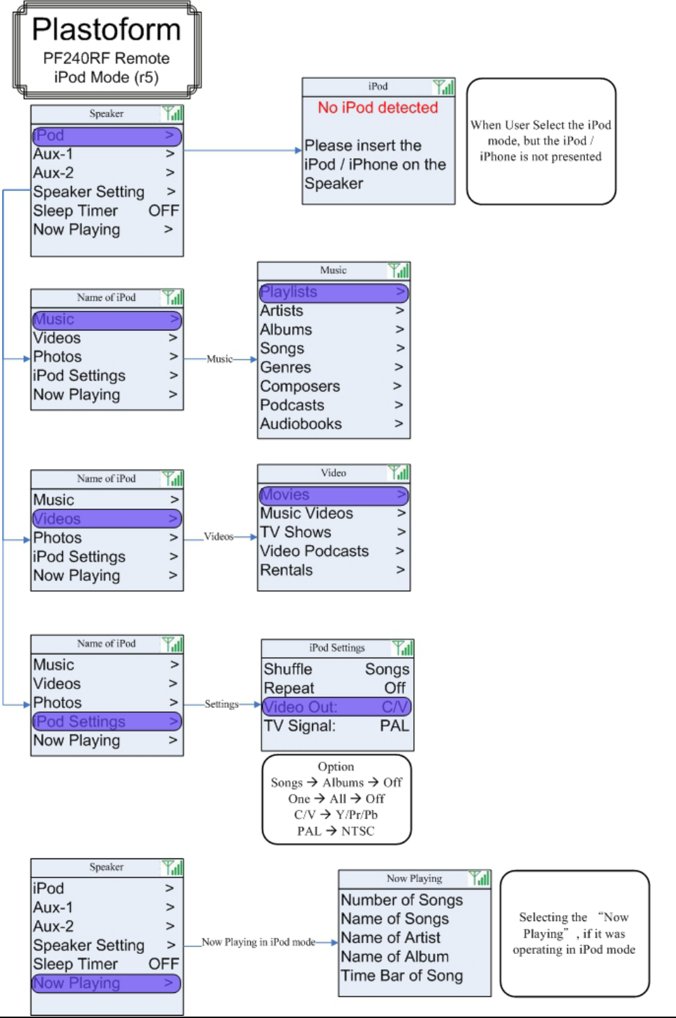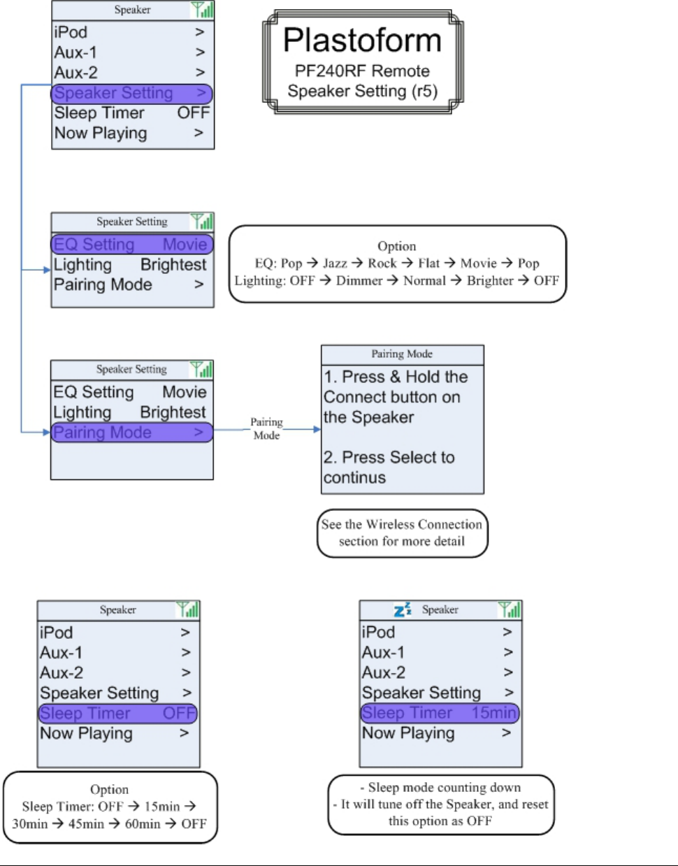 Default mode when Power ON the speaker in the first time= “Main Menu”
