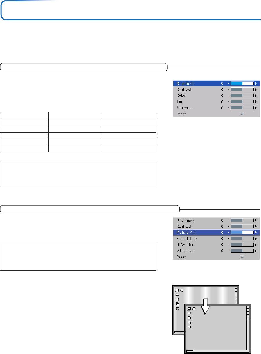 Manual adjustments may be required for some input signals. See “Picture Adj. / Fine Picture / H Position / V Position” on page E-