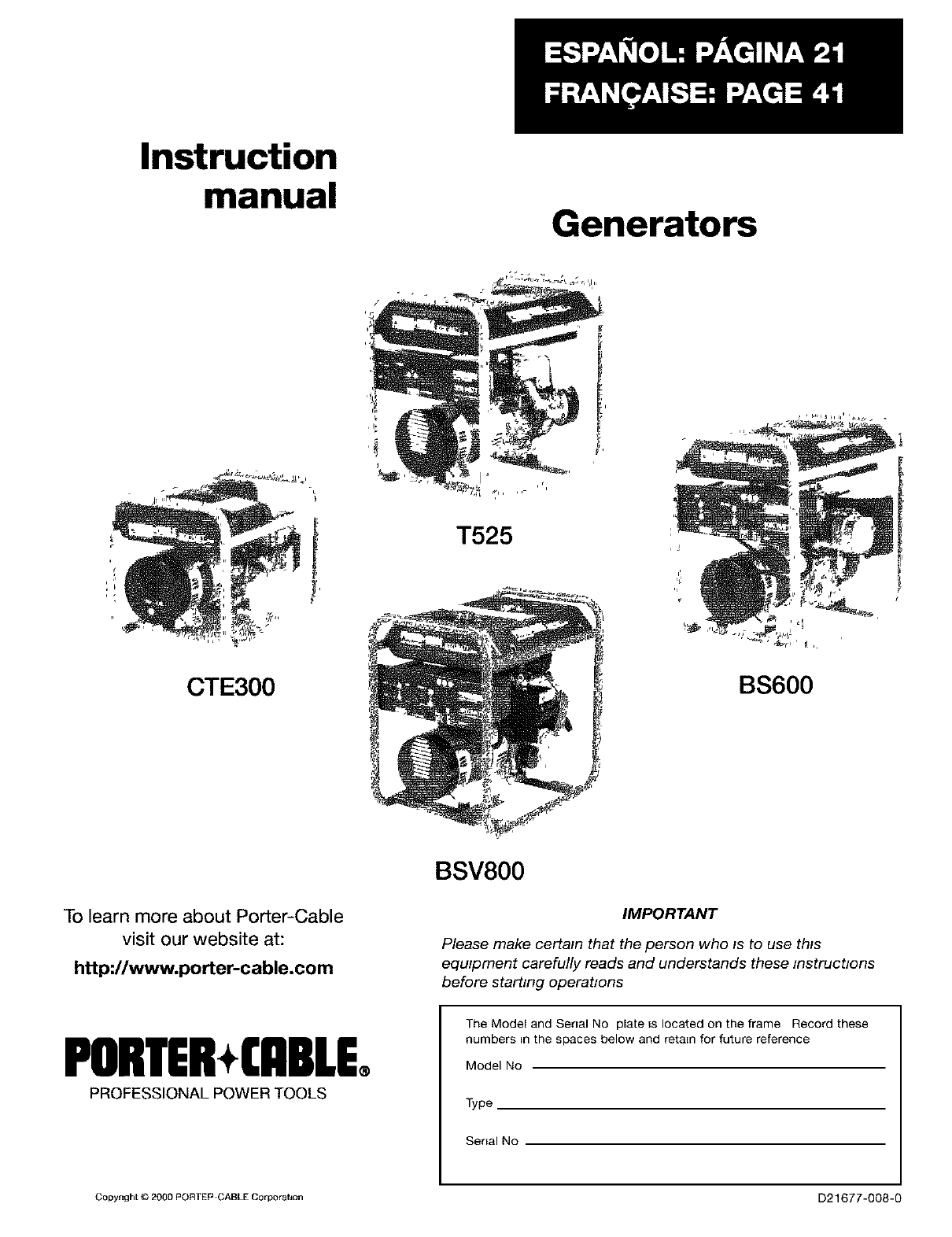 User Manual: Porter Cable BS600-W-1 BS600-W-1 PORTER CABLE GENERATOR - Manuals and Guides View the owners manual for your PORTER CABLE GENERATOR #BS600W1. Home:Tool Parts:Porter Cable Parts:Porter Cable GENERATOR Manual