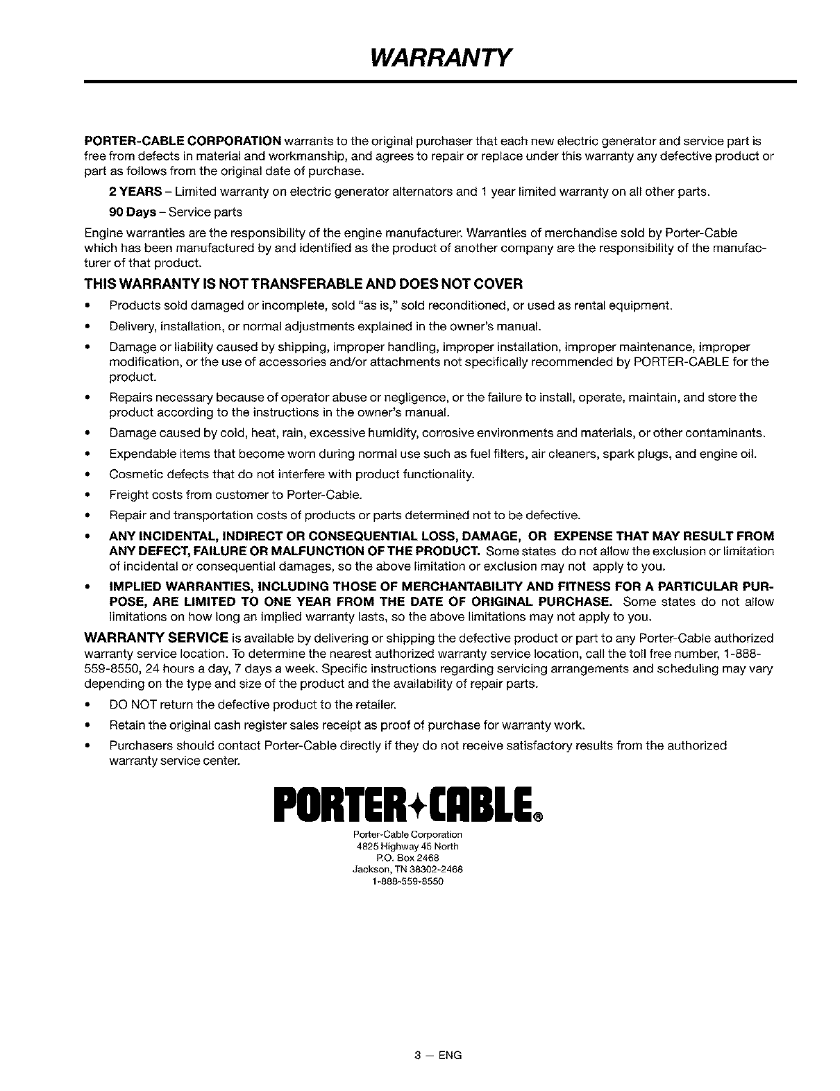 Engine warranties are the responsibility of the engine manufacturer. Warranties of merchandise sold by Porter-Cable