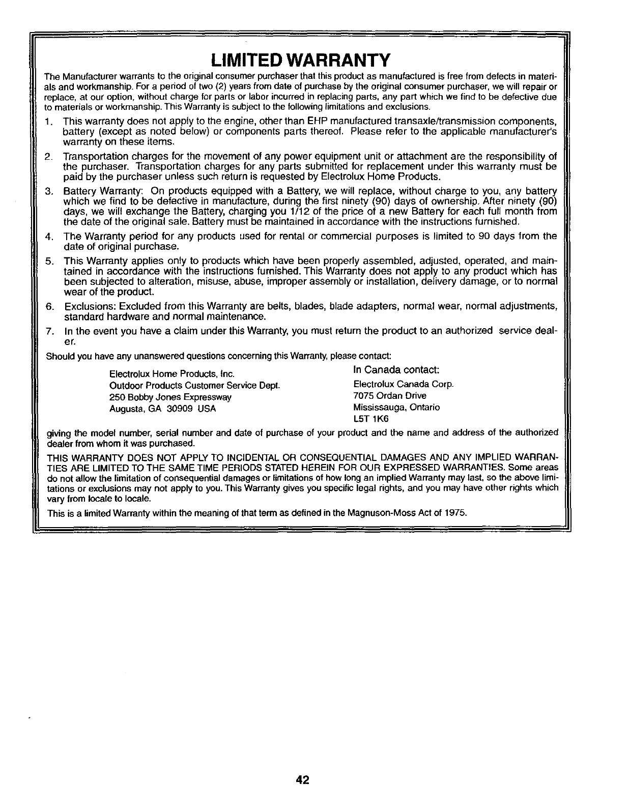 Outdoor Products Customer Service Dept. Electrolux Canada Corp.