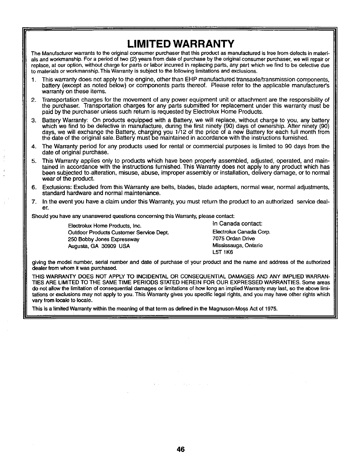 Outdoor Products Customer Sen/ice Dept. Electrolux Canada Corp.