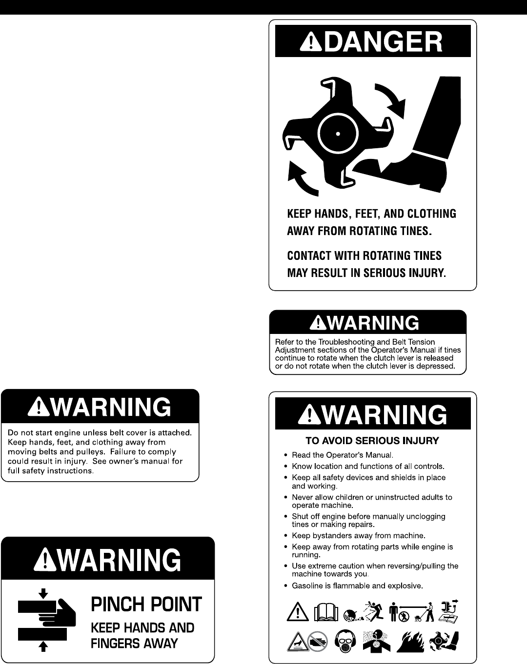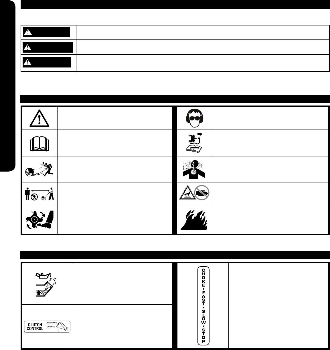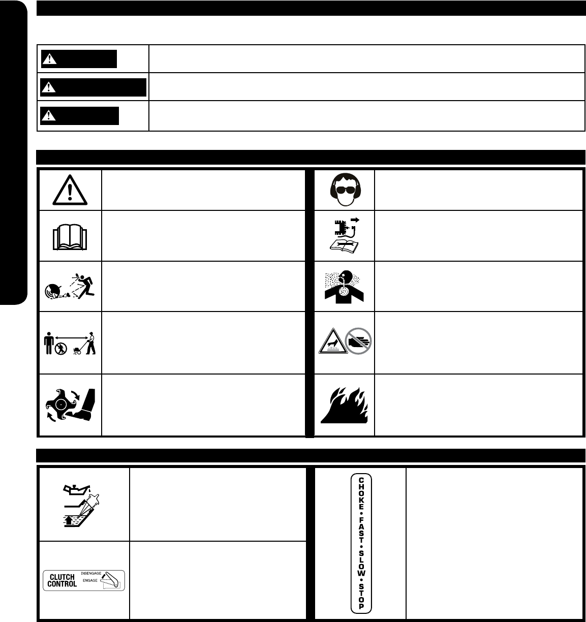 The following symbols can be found on your tiller. Carefully read and understand their meaning.