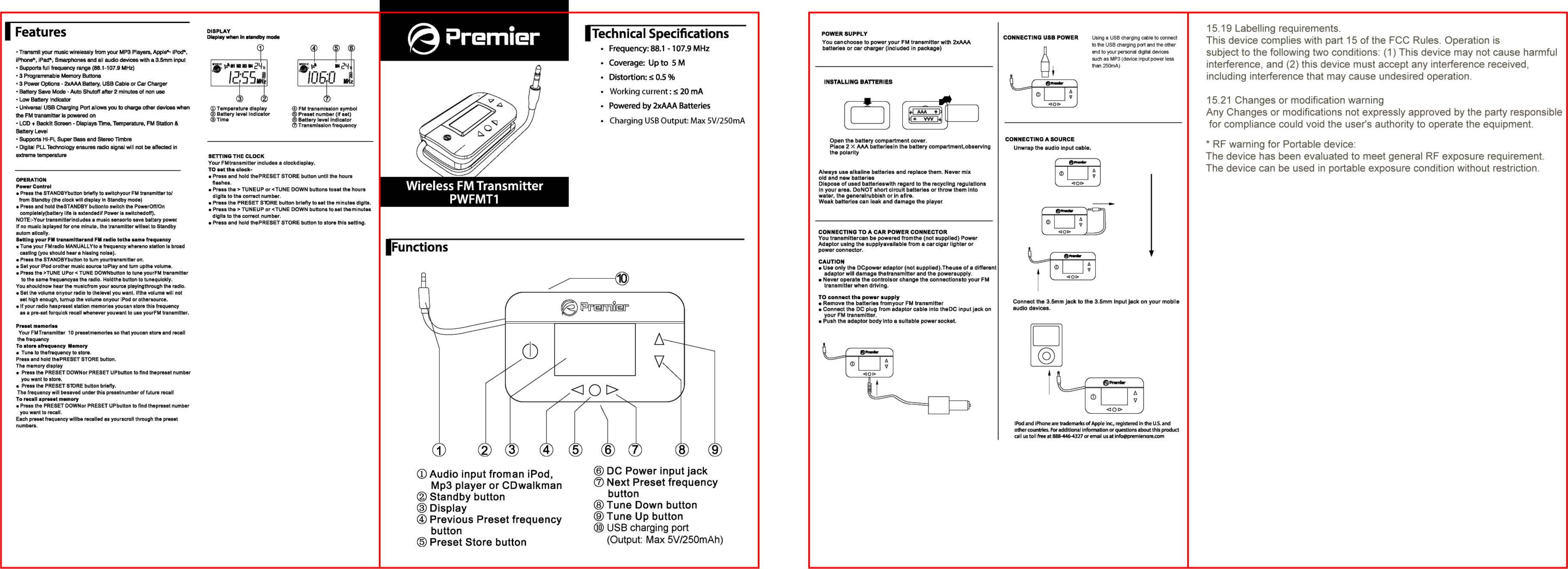 Premier Accessory Group PWFMT1 FM Transmitter User Manual